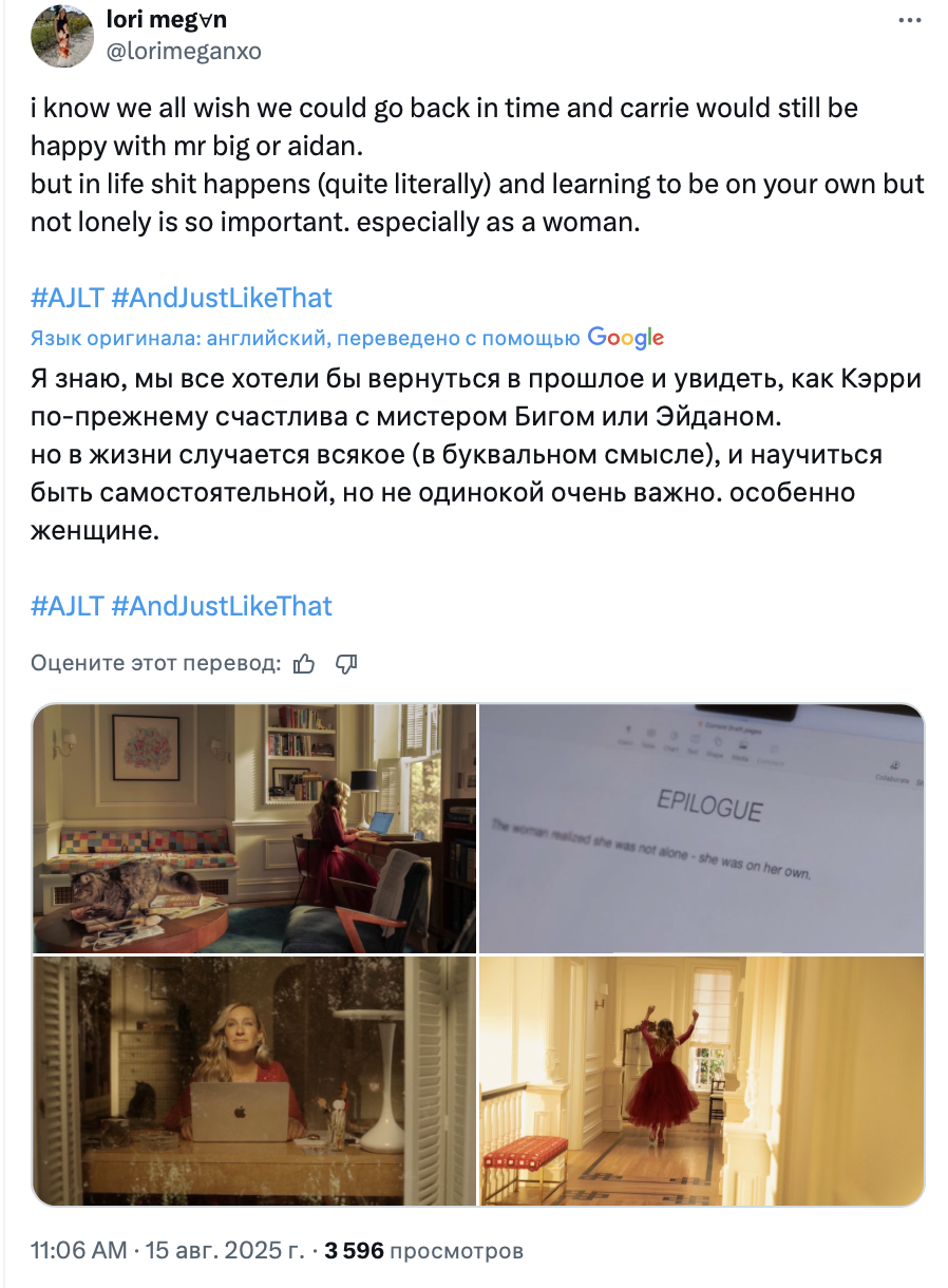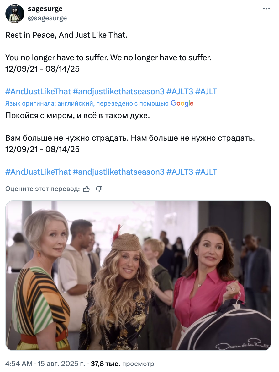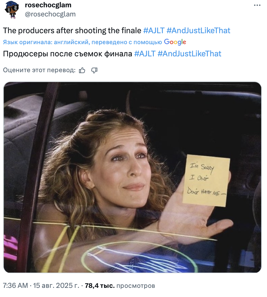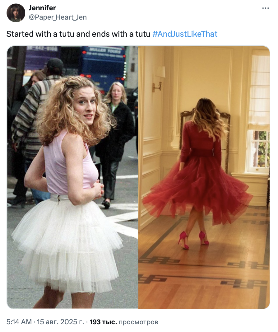 Финал «И просто так», ожидаемо, вызвал у зрителей противоречивые чувства. Посты в твиттере, посвящённые героине Сары Джессики Паркер и проекту в целом, оказались пропитаны одновременно грустью, иронией и даже злостью. Собрали 10 мнений о завершении спин-оффа «Секса в большом городе».