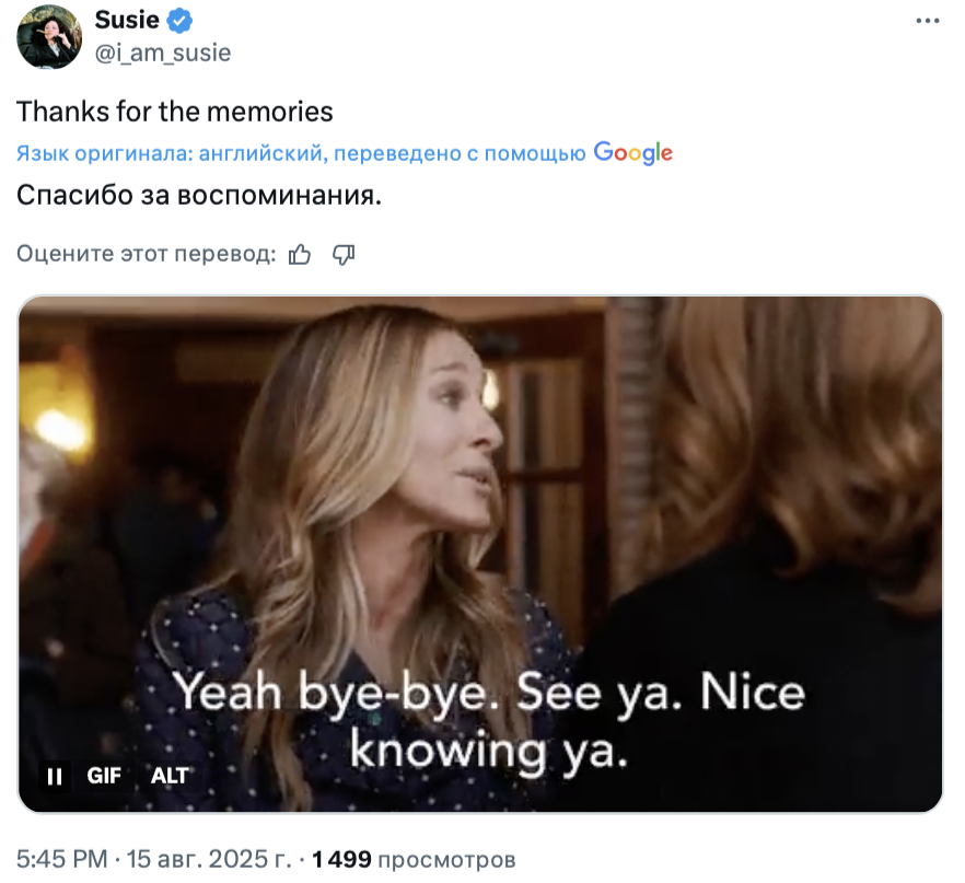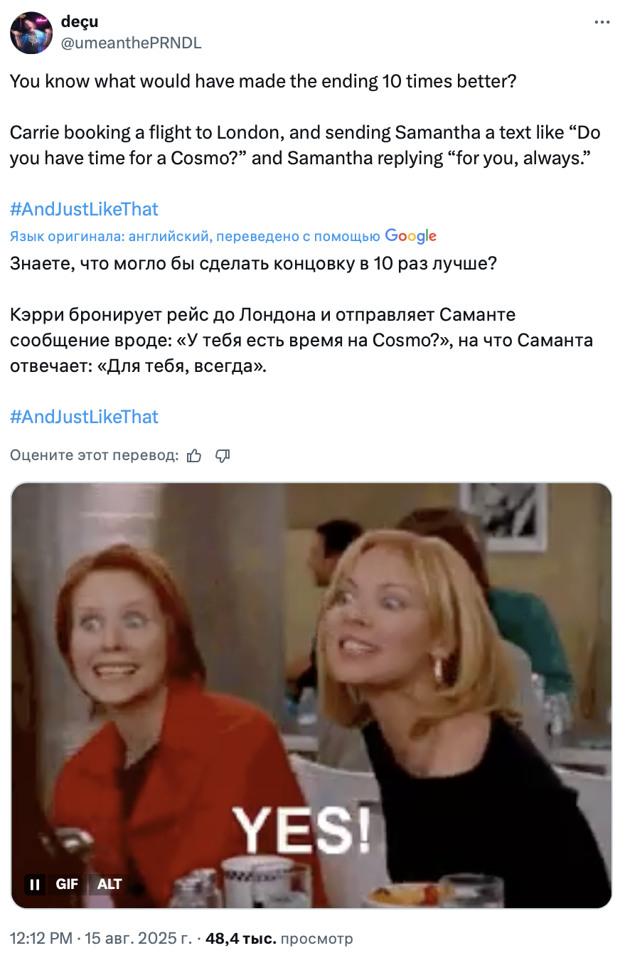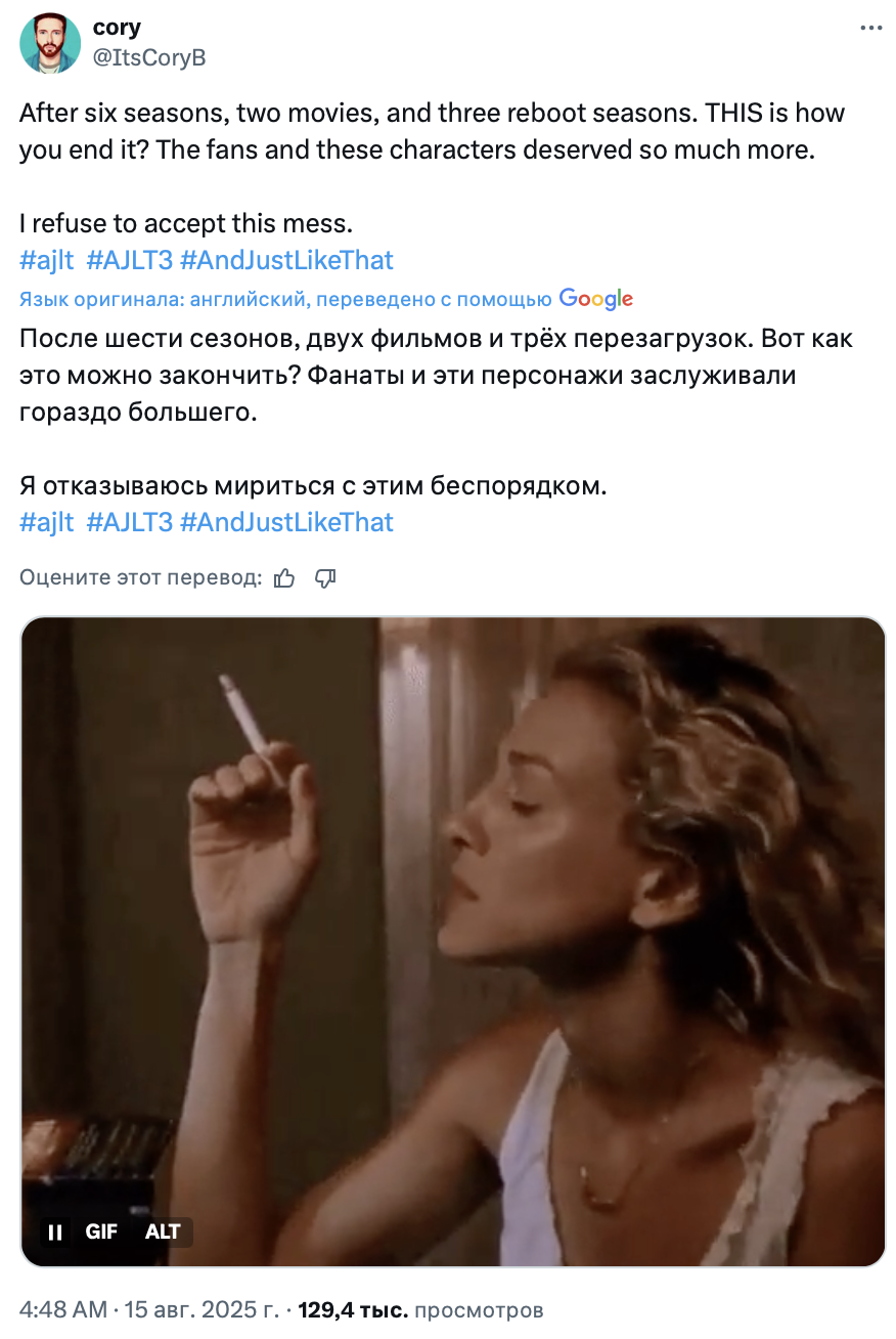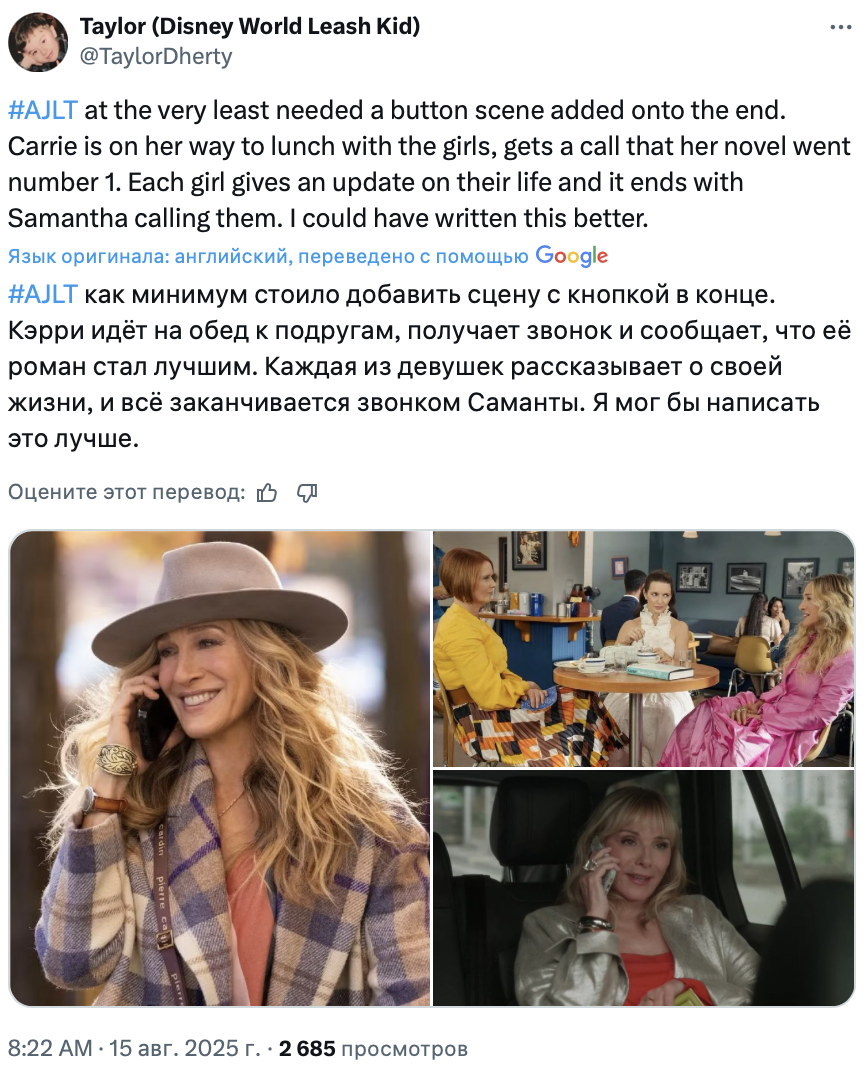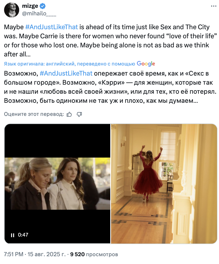 Финал «И просто так», ожидаемо, вызвал у зрителей противоречивые чувства. Посты в твиттере, посвящённые героине Сары Джессики Паркер и проекту в целом, оказались пропитаны одновременно грустью, иронией и даже злостью. Собрали 10 мнений о завершении спин-оффа «Секса в большом городе».