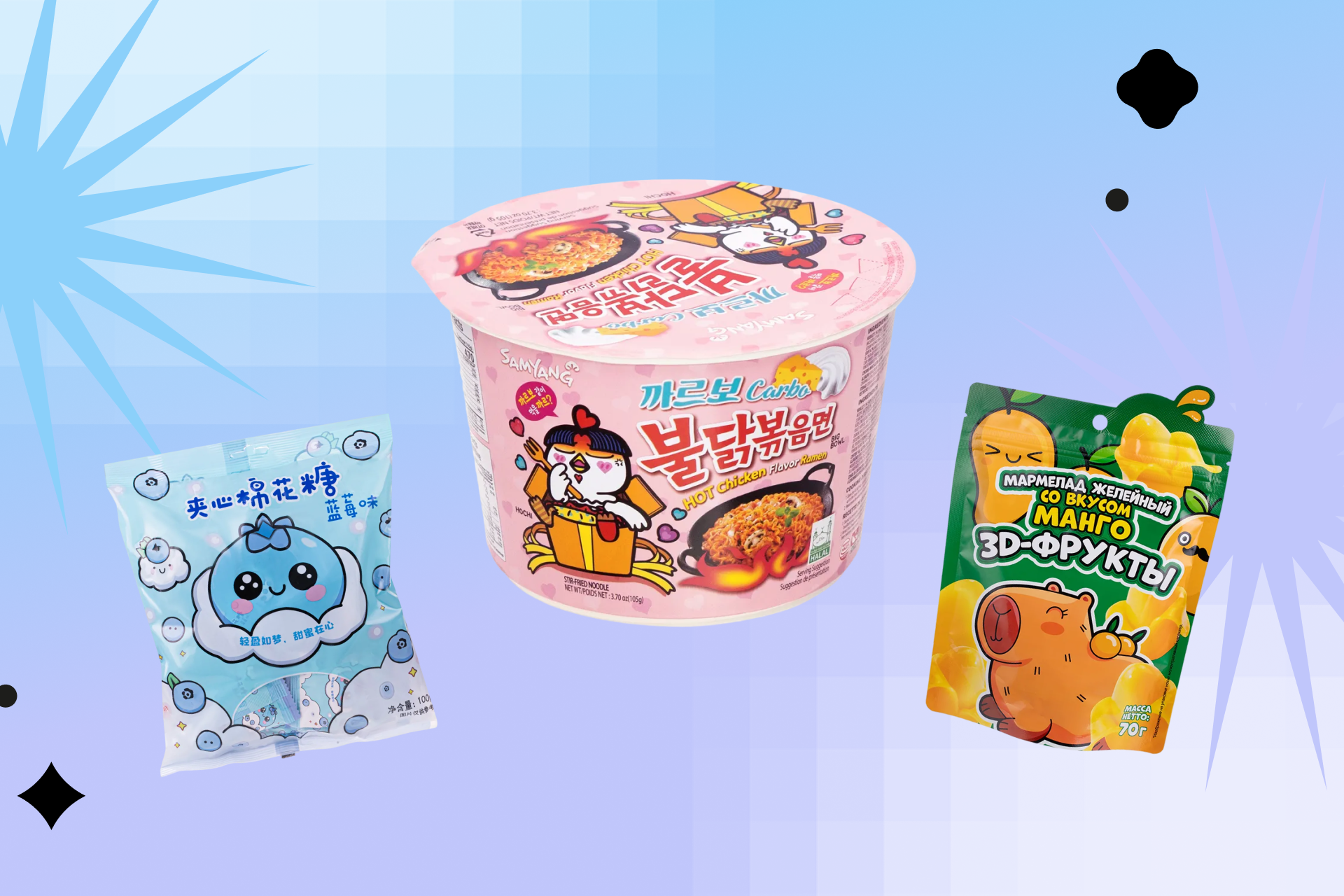 Если ваша подопечная любит пробовать новое или обожает азиатскую эстетику, ей может понравиться тематический набор. Положите в подарочный пакет или коробку снеки, напиток, необычные сладости — получится яркий и запоминающийся сюрприз. Формат подарка «на пробу» хорош ещё тем, что подходит почти всем — не нужно подстраиваться под стиль и вкусы получательницы.