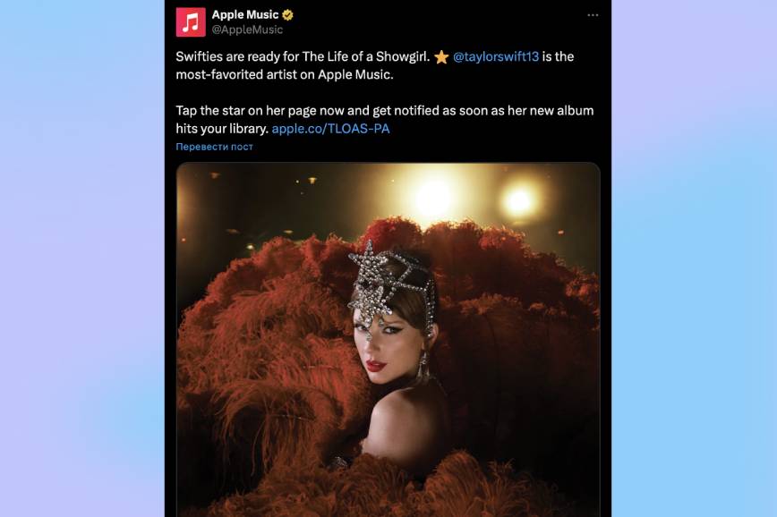 «Тейлор не просто создаёт музыку, она творит историю. Самый популярный артист Apple Music всех времён: королева остаётся непревзойдённой».