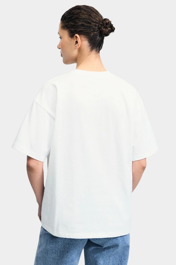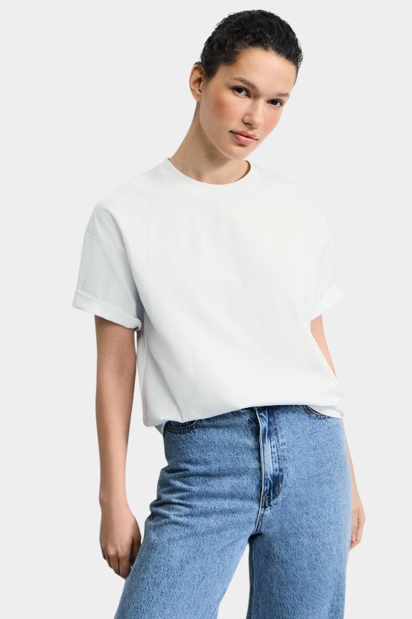 Во-вторых, у неё классический универсальный крой: круглый воротник, свободные рукава чуть выше локтя и оптимальная длина — она прикрывает ягодицы. Изделие достаточно просторное, чтобы оно не сковывало движения, а вы не переживали, что футболка облегает не в тех местах. Но вместе с этим её удобно надевать под кардиганы, кофты и пиджаки и не чувствовать себя многослойной капустой.