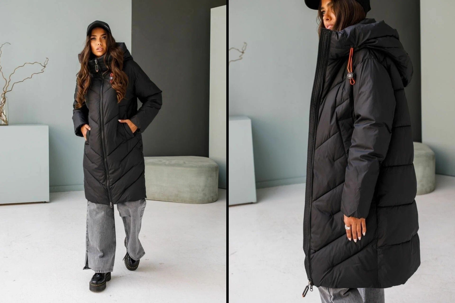 Модель удлинённая: в зависимости от роста и типа фигуры она доходит либо до колен, либо чуть ниже. Крой — прямой, поэтому силуэт не выглядит объёмным. По бокам расположены прорезные карманы, внутри которых есть специальная кнопка-застёжка. Из декоративных элементов важно отметить шнуровку и стопперы на капюшоне оранжевого цвета. Если вам покажется, что они выглядят слишком броско, то их можно заменить на более нейтральные детали.