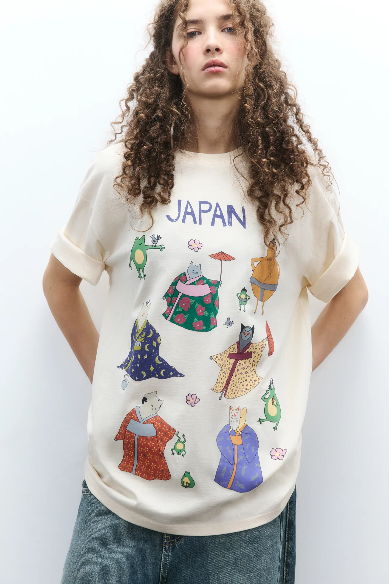 Удлинённая футболка с азиатским принтом из хлопка. Она может стать также комфортной домашней одеждой и удобной ночнушкой.