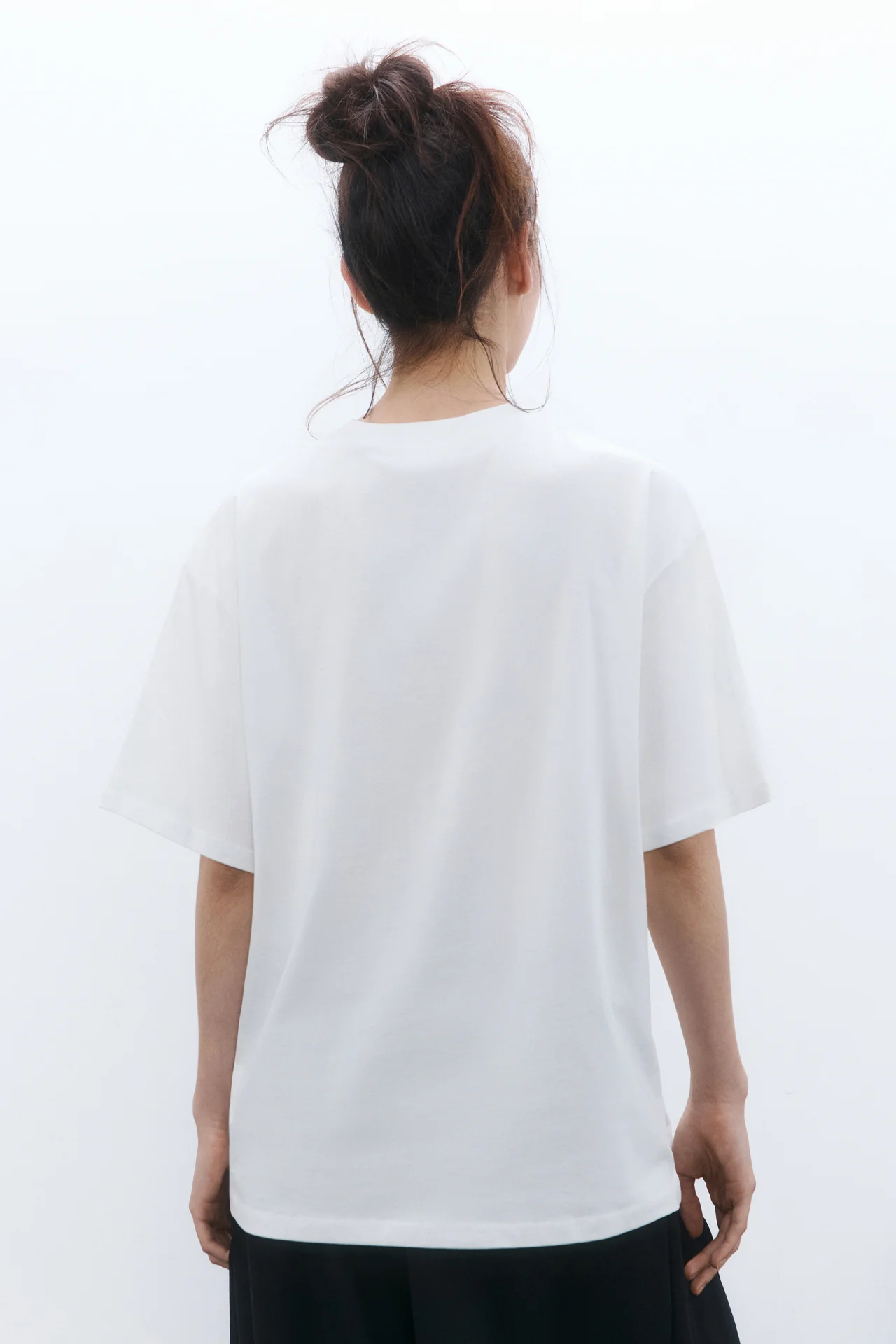 Футболка унисекс свободного кроя из мягкого хлопка средней плотности. Удлинённые рукава до локтя со спущенной линией плеча. Круглый вырез горловины без воротника.