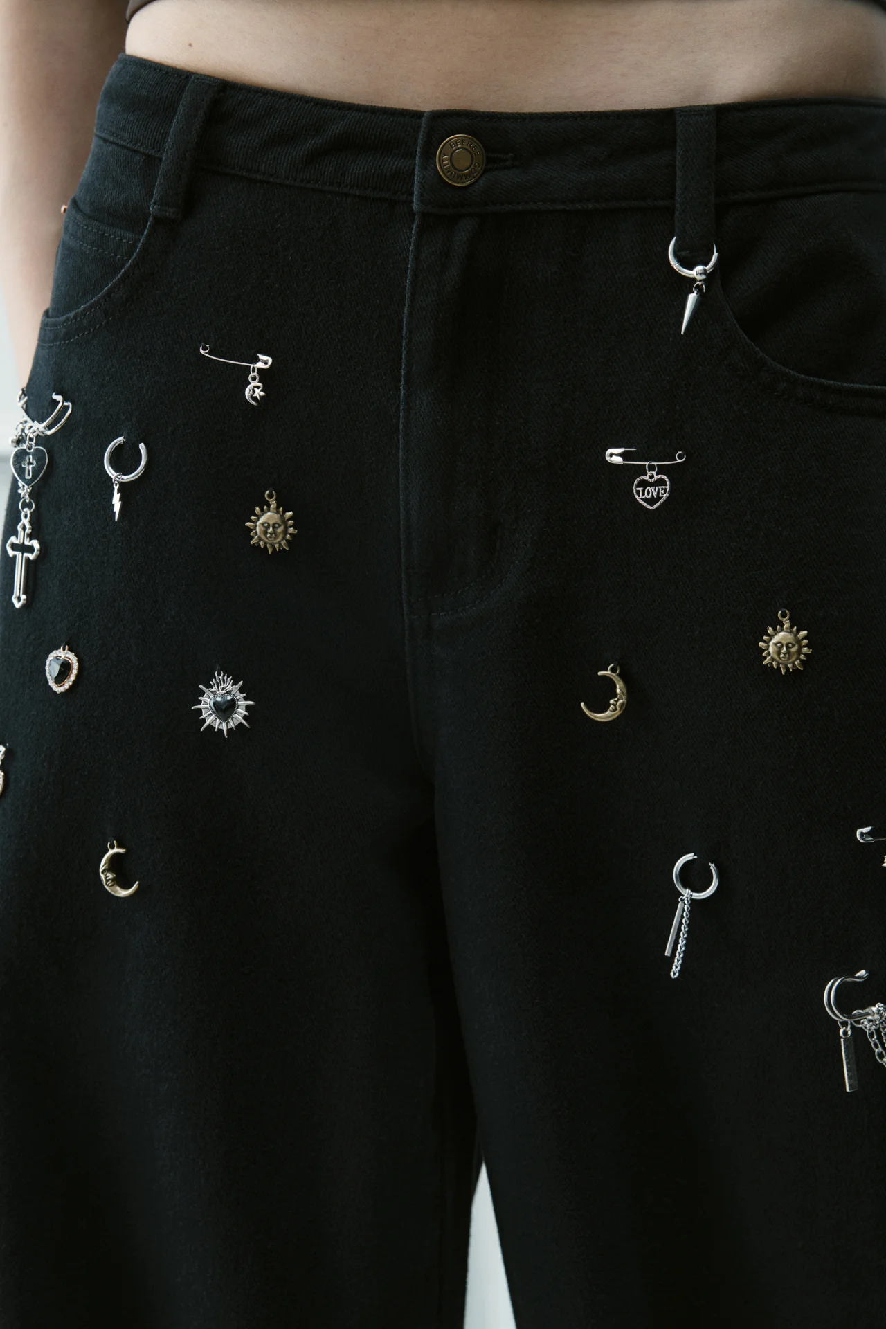 Прямые женские брюки из хлопковой ткани с подвесками. Классическая средняя посадка по талии выгодно подчёркивает фигуру и акцентирует внимание на талии. Два боковых кармана с отрезным бочком спереди, два прорезных кармана сзади. Застёжка на молнию и пуговицу спереди, шлёвки для ремня.