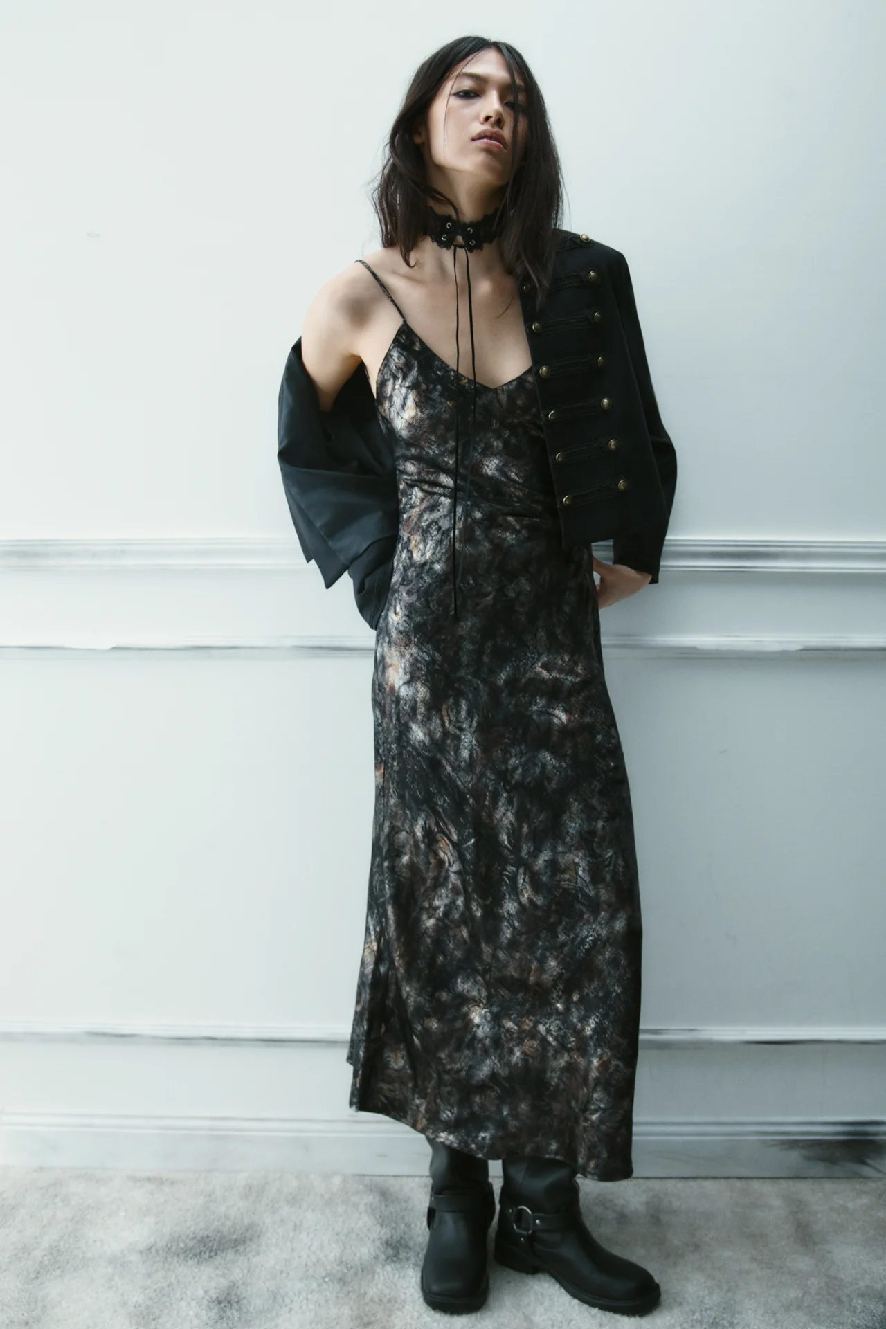 Длинное женское платье-комбинация миди облегающего кроя из гладкой блестящей ткани. Глубокий V‑образный вырез декольте, открытая спина. Тонкие бретели, завязывающиеся на шее. Прямая юбка ниже колена без разрезов.
