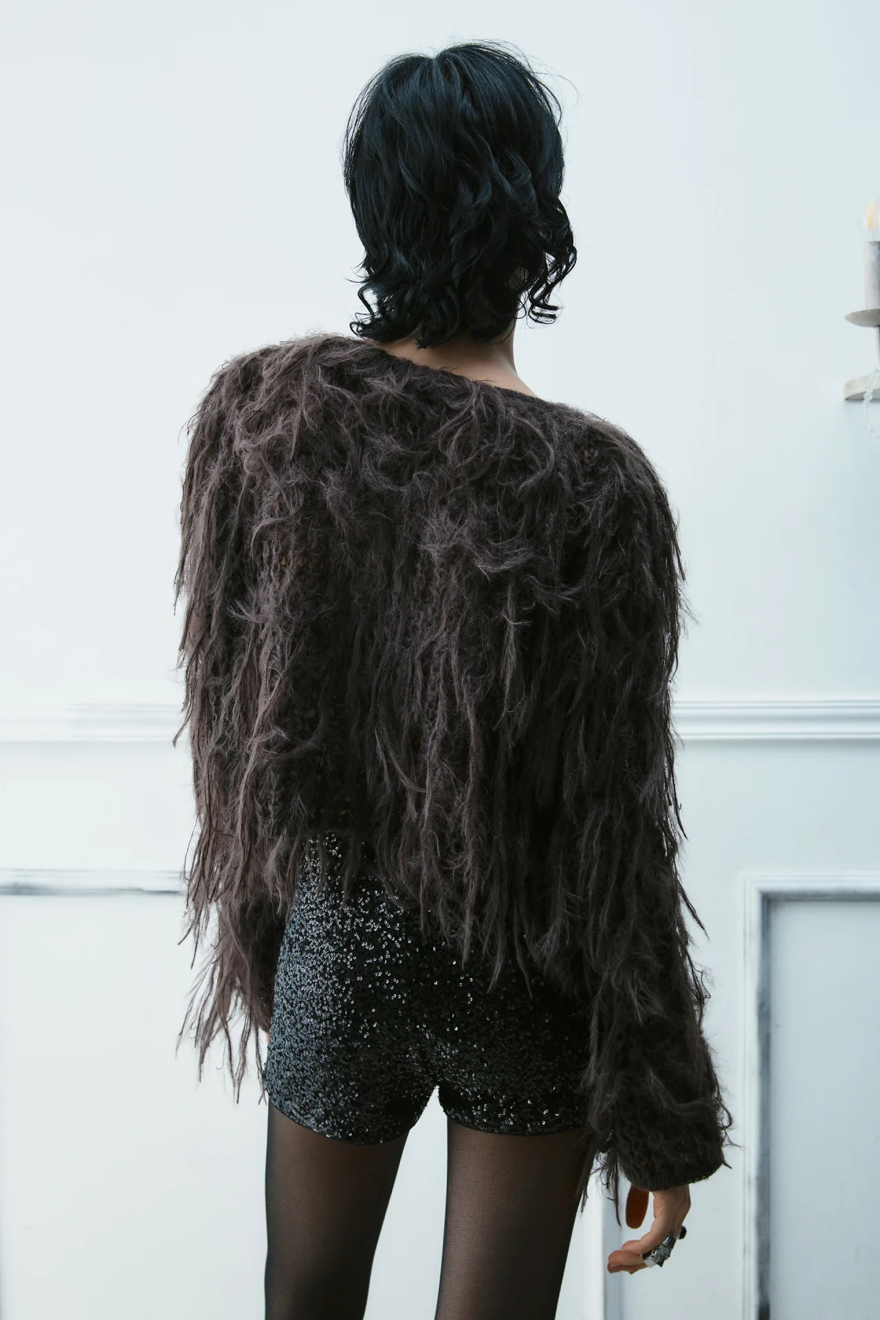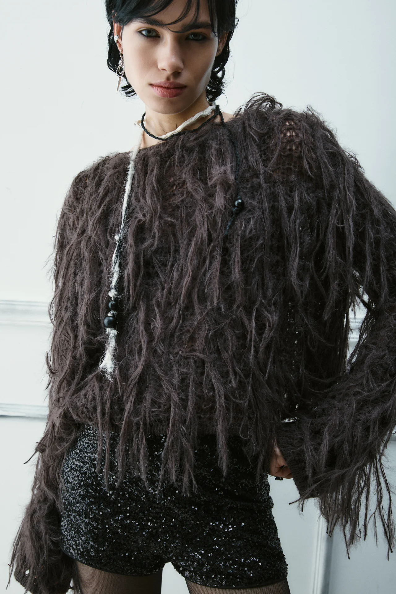 Женский джемпер полуприлегающего кроя из плотной ткани со сплошной бахромой по всей длине. Высокий вырез-лодочка без воротника. Длинные свободные рукава с прямыми манжетами и спущенной линией плеча.