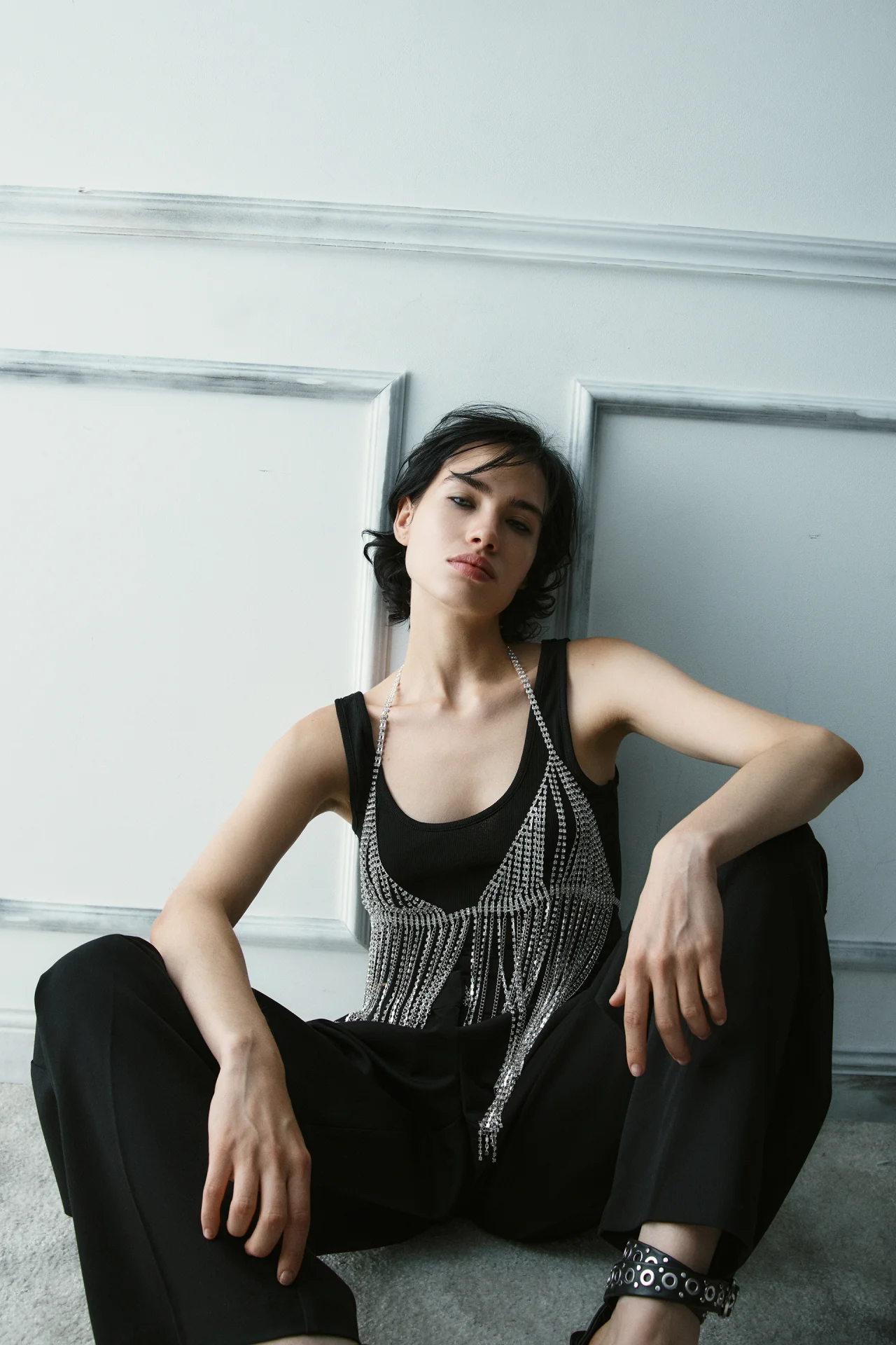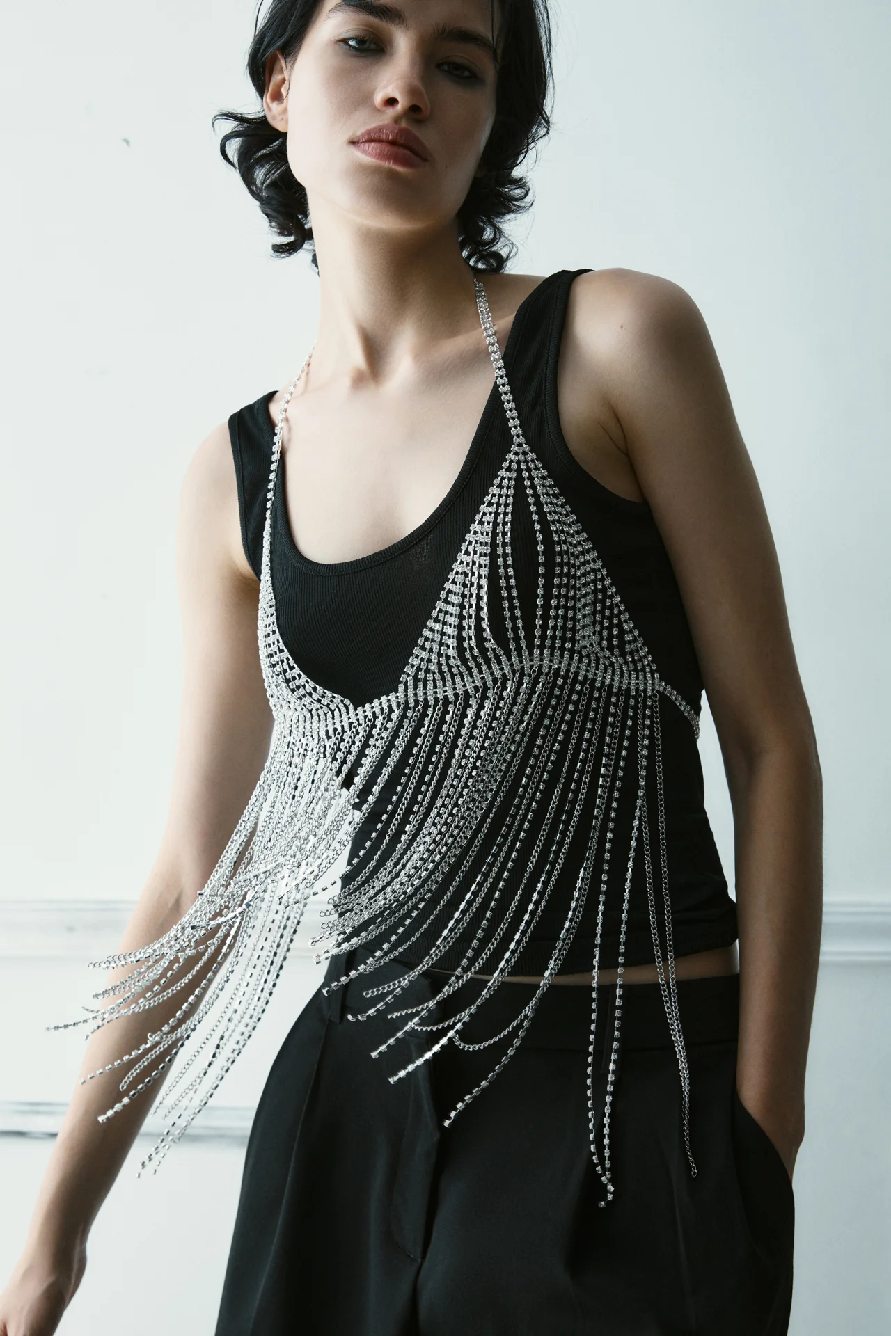 Декоративное серебристое бра из звеньев со стразами. Застёжка на маленький карабин на шее и на спине с дополнительными цепочками для регулировки по длине.