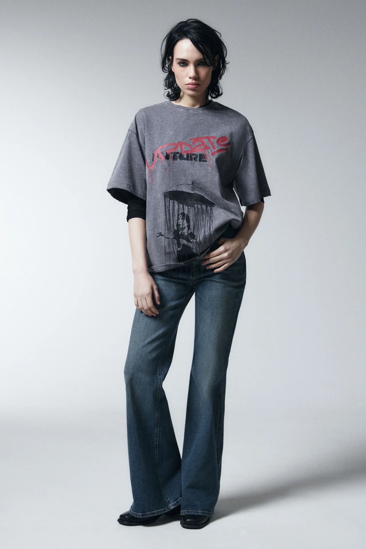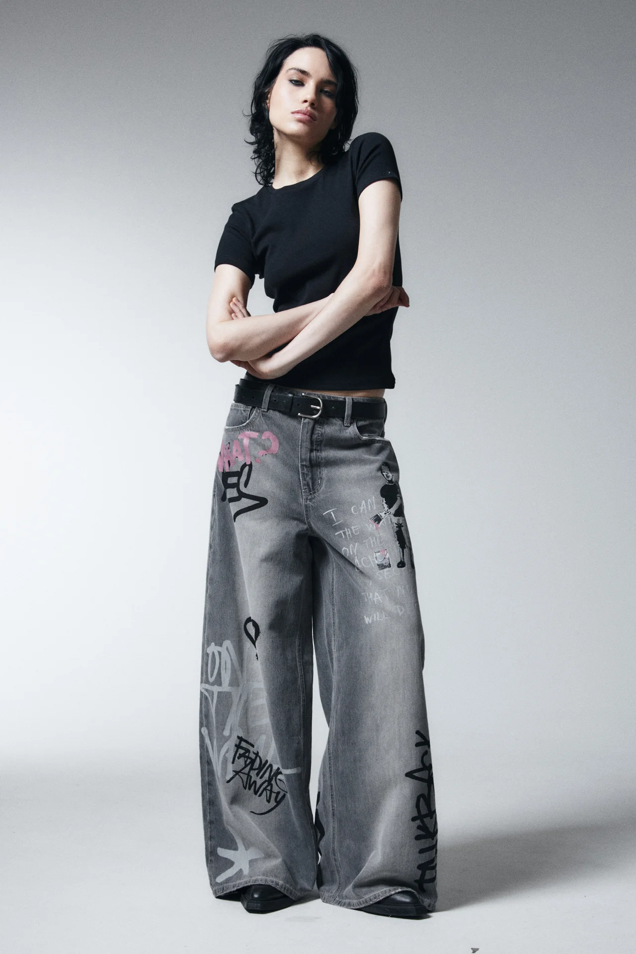 Унисекс-футболка свободного кроя oversize с принтом-граффити. Удлинённые рукава до локтя со спущенной линией плеча. Круглый вырез горловины без воротника. Прямой нижний край без разрезов.
