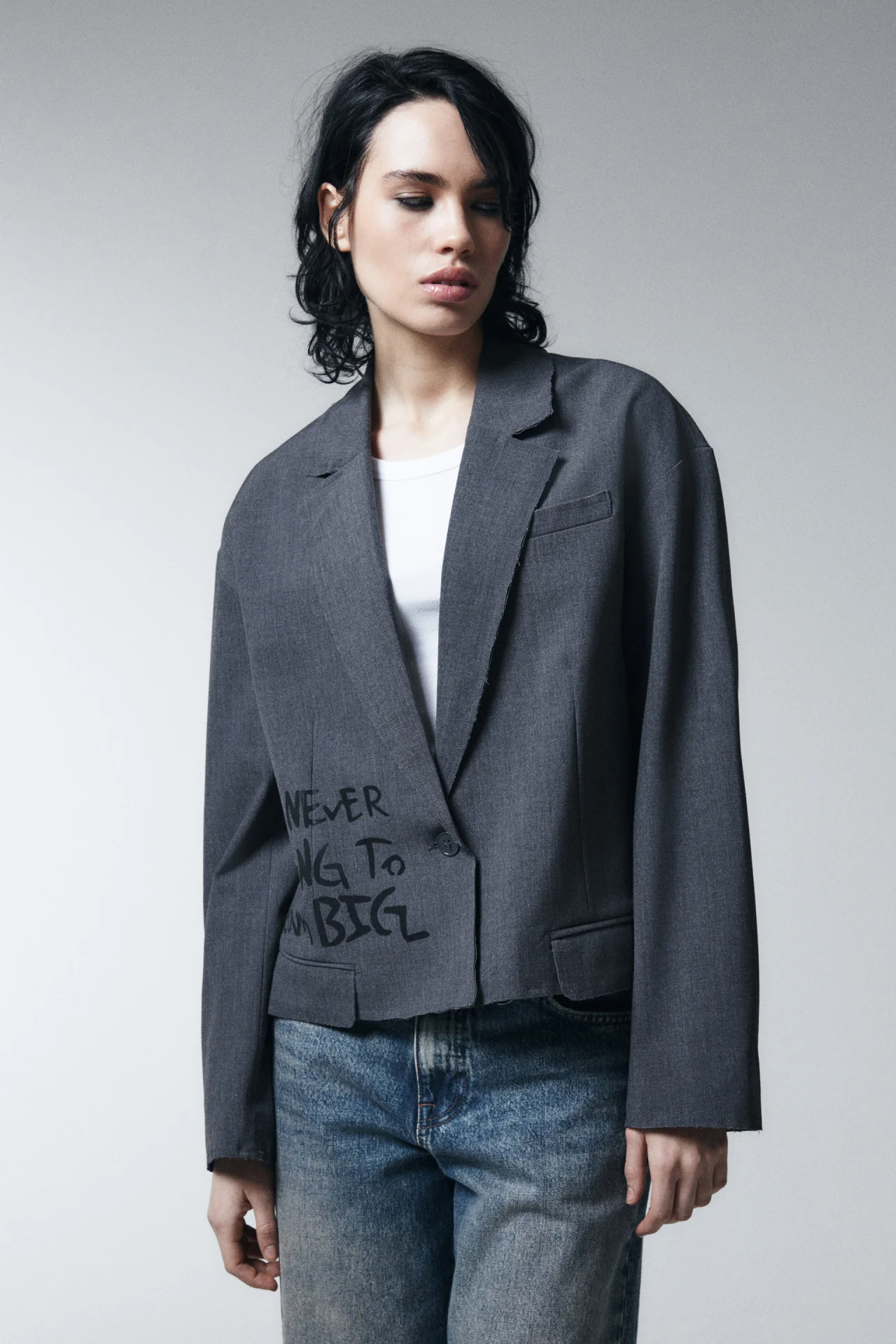 Стильный пиджак с фразами-манифестами. Свободного кроя. Широкий отложной воротник с лацканами. Застёжка на крупную пуговицу спереди. Два боковых прорезных кармана с клапанами, нагрудный прорезной карман. Длинные свободные рукава с подплечниками и прямыми манжетами.