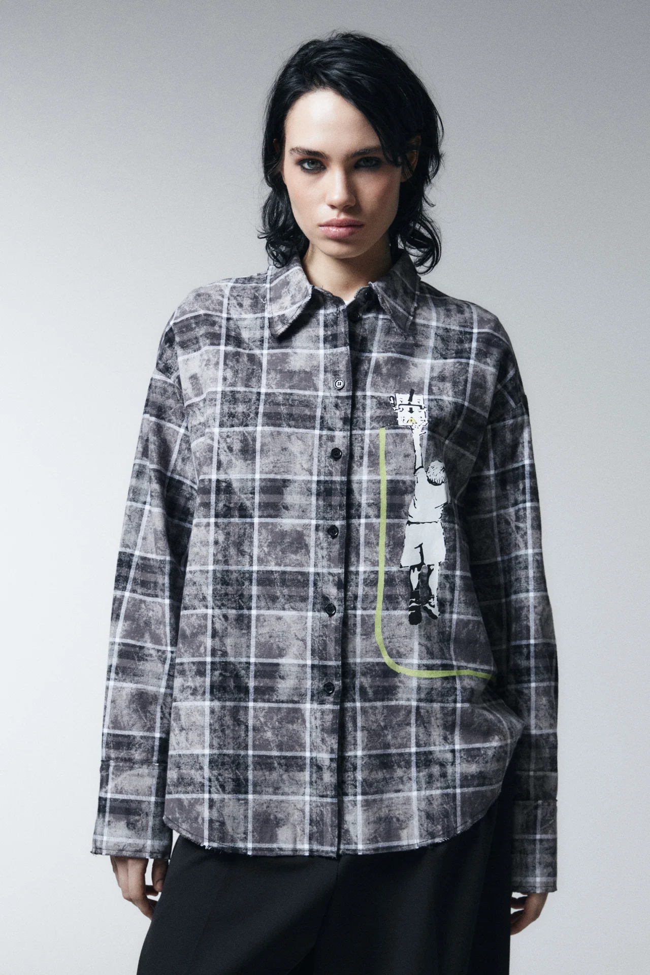 Удлинённая женская рубашка прямого кроя. Отложной воротник с застёжкой под горло. Длинные свободные рукава с широкими манжетами на пуговицах и спущенной линией плеча. Застёжка на пуговицы по всей длине спереди. Необработанные края.