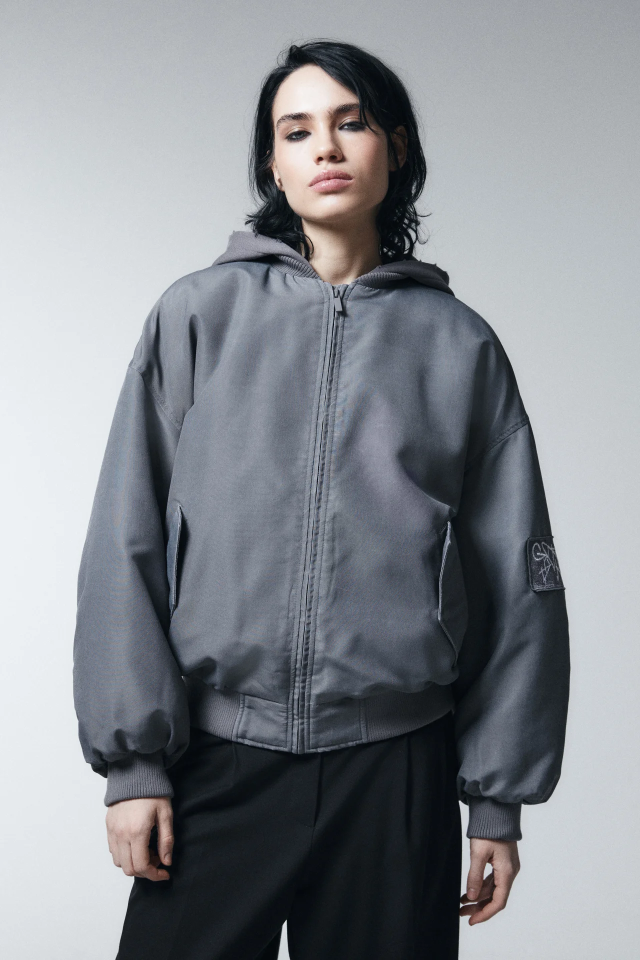 Женская куртка-бомбер свободного кроя oversize из плотной ткани с утеплителем. Несъёмный объёмный капюшон без завязок и утяжек, трикотажный воротник-стойка. Длинные свободные рукава с широкими трикотажными манжетами и сборками сзади, спущенная линия плеча. Декоративный патч с принтом на рукаве. Застёжка на молнию по всей длине. Два боковых прорезных кармана с клапанами.