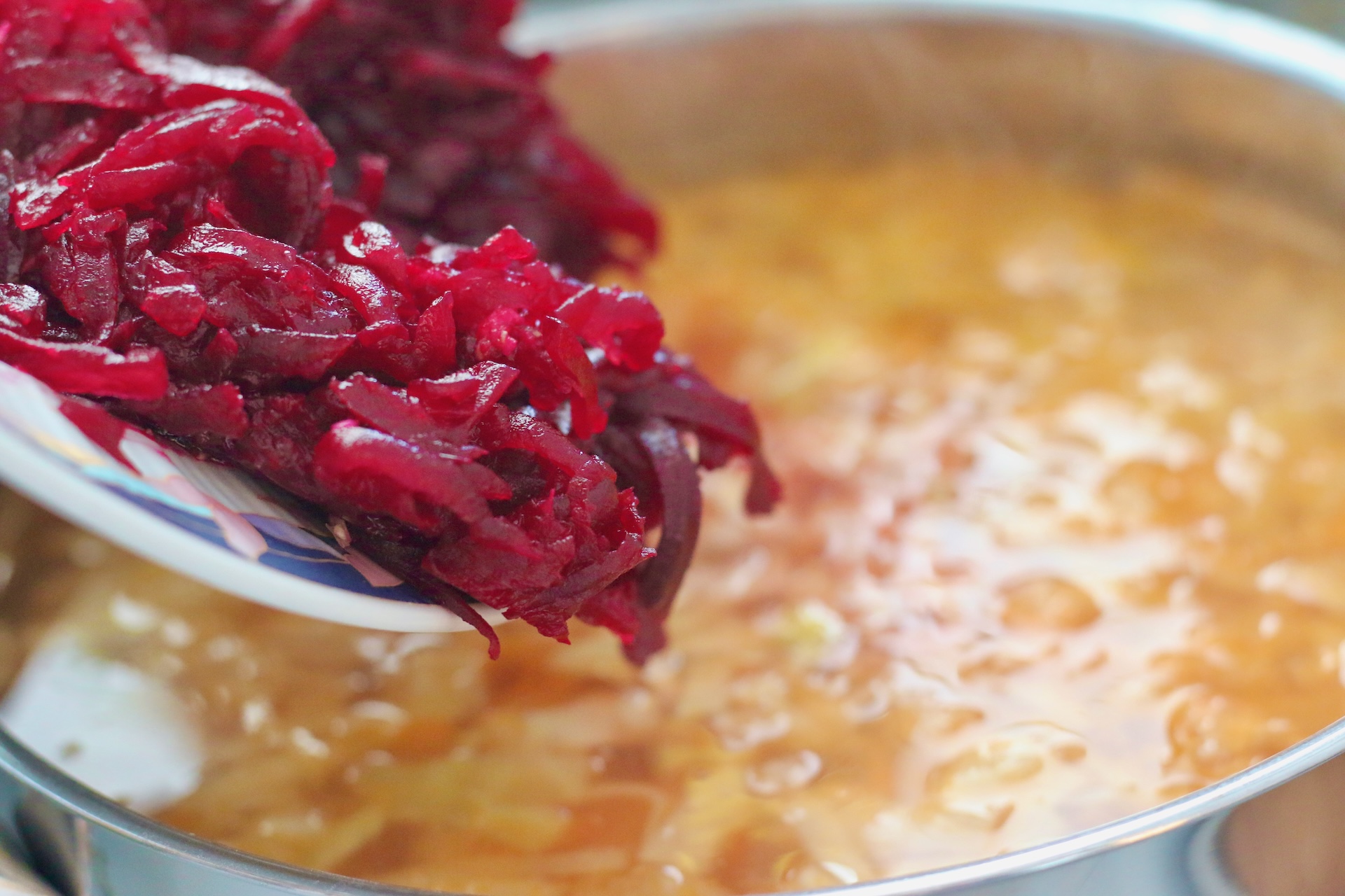 13. Когда картофель станет мягким, закиньте в суп свёклу и мясо.
