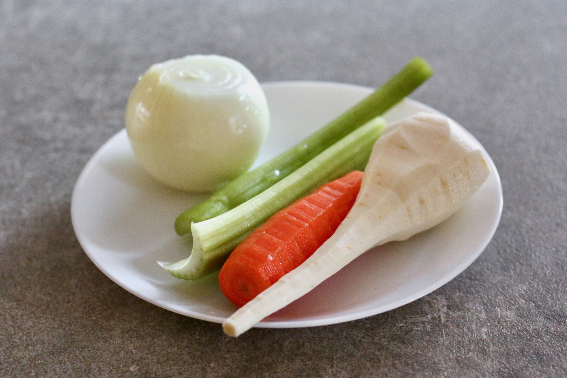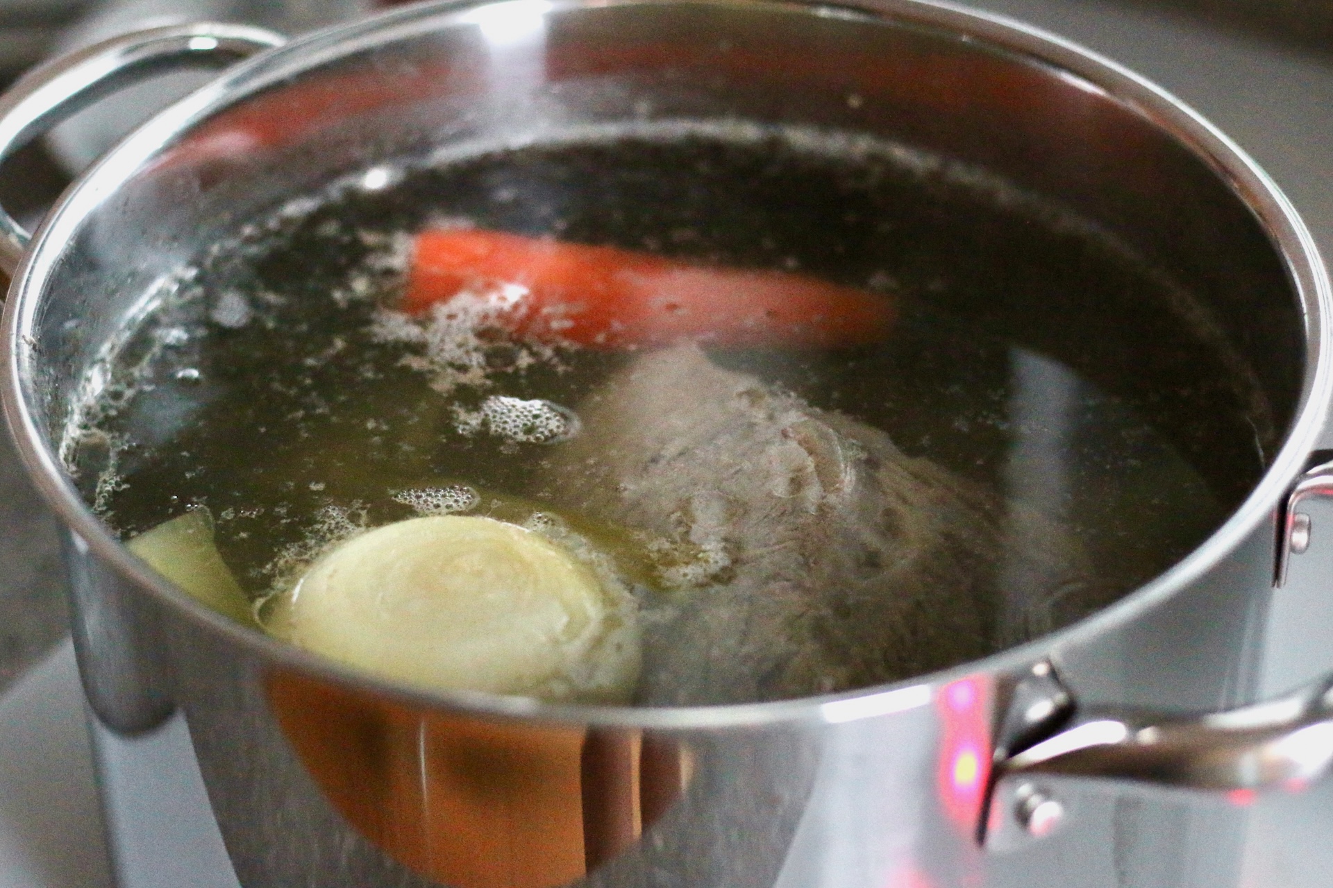 2. Положите в бульон очищенные корнеплоды: луковицу, одну морковь и корень петрушки, а также стебель сельдерея. Уменьшите огонь до минимального и варите в течение часа. Затем добавьте половину столовой ложки соли и перец горошком. Варите ещё полчаса и выключите огонь — бульон готов. При желании его можно сделать накануне варки борща.