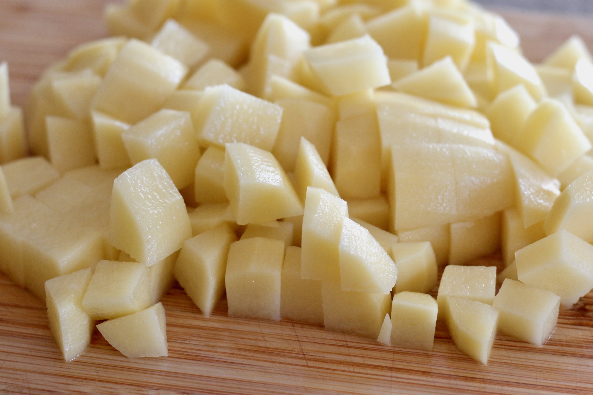7. Очистите картофель. Нарежьте небольшими кубиками и добавьте в бульон. Варите на среднем огне.