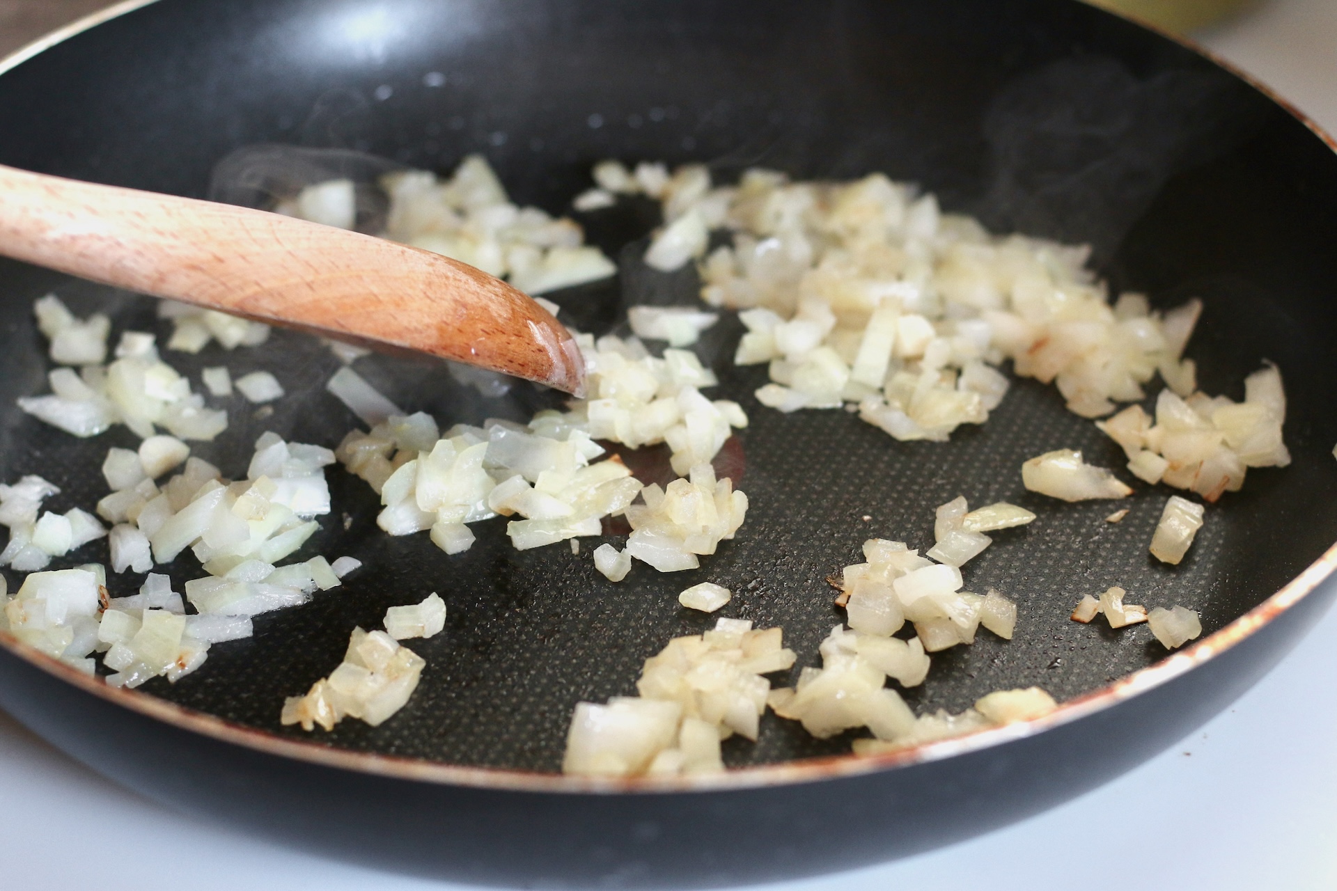 8. Очистите и мелко нашинкуйте луковицу. Обжарьте в растительном масле на среднем огне до золотистого цвета. Это займёт 3–5 минут.