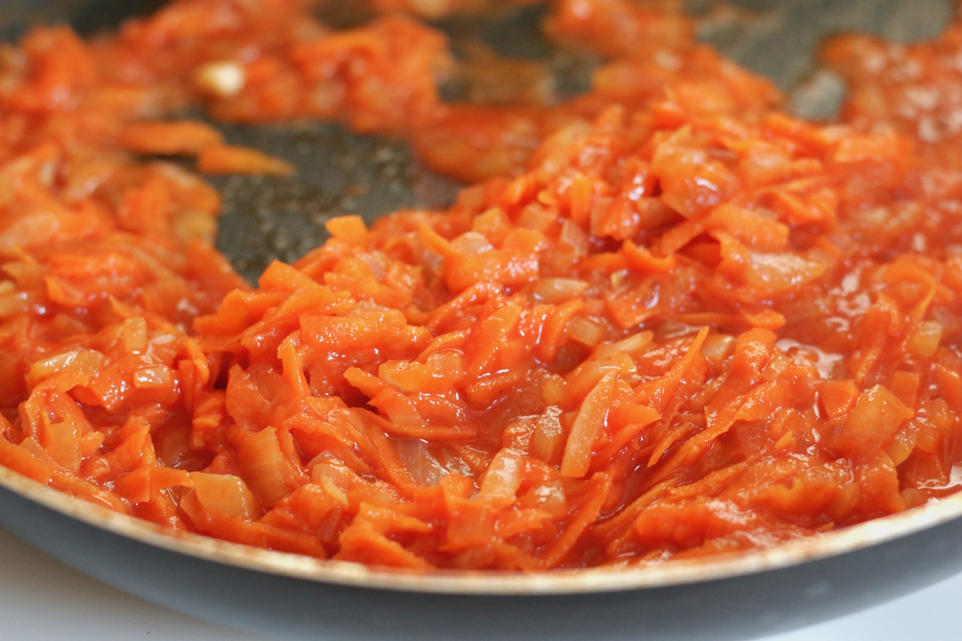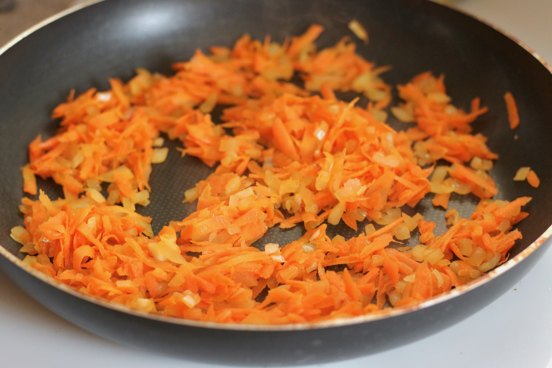 9. Закиньте очищенную и натёртую на крупной тёрке морковь. Пассеруйте до тех пор, пока зажарка не станет оранжевой. Это займет пару минут.