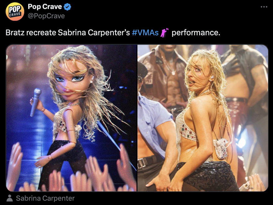 Сабрина Карпентер получила свою куклу Bratz. Но только на картинке. Бренд решил отметить её яркое выступление на церемонии вручения премии MTV Video Music Awards 2025, где она исполнила новый трек Tears с альбома Man’s Best Friend.
