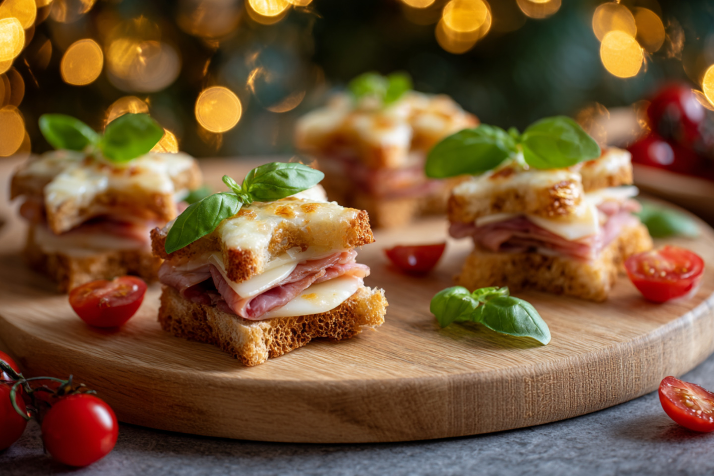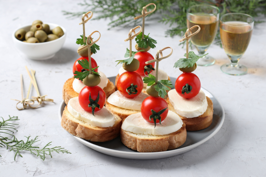 Это простая, но яркая закуска. Праздничные бутерброды с моцареллой и помидорами черри — беспроигрышная вариация на тему итальянского салата капрезе.