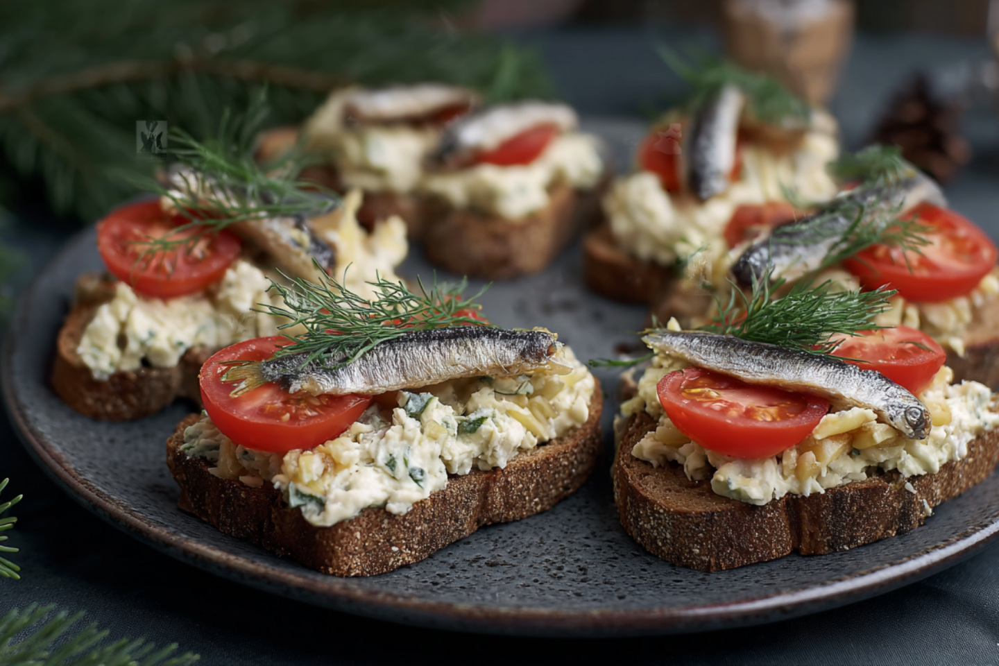Это простой вариант новогодней закуски с узнаваемым, с детства знакомым вкусом. Яичная намазка добавляет мягкости, селёдка даёт насыщенный вкус, а цельнозерновой багет делает бутерброд чуть интереснее.