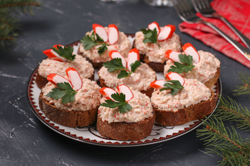 Эти бутерброды точно оценят все любители крабового салата, ведь в их основе — варёные яйца и крабовые палочки. Особенно вкусно получается с хрустящим поджаренным хлебом.