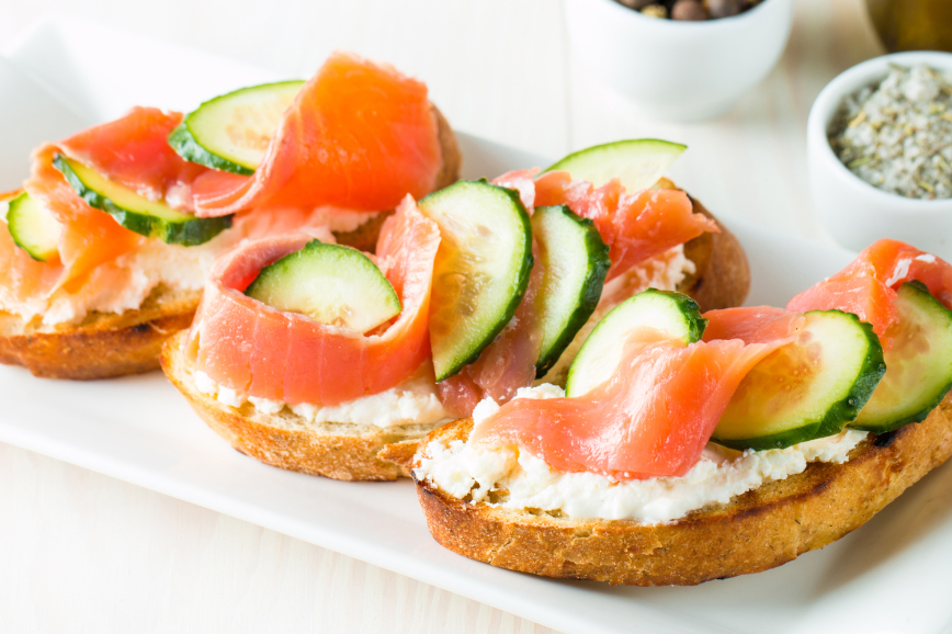 Вариант для тех, кто хочет сделать бутерброды с красной рыбой более нарядными и яркими на вкус. Просто добавьте огурец — получится свежо и оригинально.