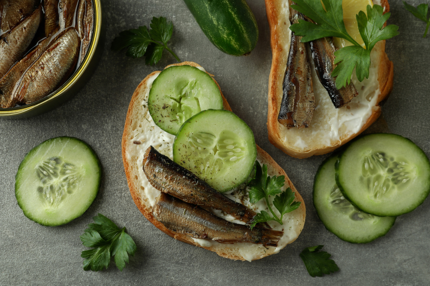 Привычная и любимая многими закуска с ярким вкусом. Для приготовления таких бутербродов можно использовать как свежие, так и солёные огурцы.