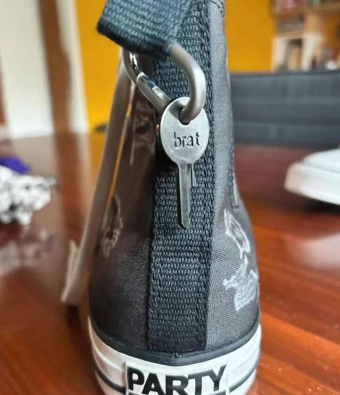 кеды по мотивам своего альбома Brat. Модель чёрного цвета, которая получила название Party Girl, будет выпущена лимитированным тиражом. Пара получилось стильной.Кеды выполнены с эффектом потёртости. Круглая нашивка с одной стороны отсылает к названию трека с альбома Brat «365». На подошве правой ноги написано Party, а на левой — Girl. Также в комплекте идёт карабин и ключик с названием пластинки Charli XCX. Эти декоративные элементы можно прицепить на петельку с задней стороны кед.