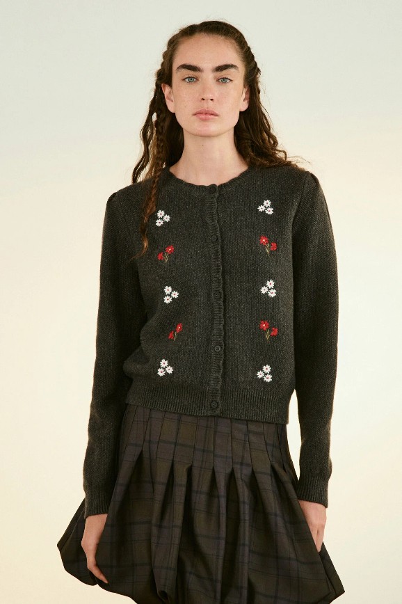 Этот кардиган отлично подходит для тех образов, когда вы в настроении побыть волшебной лесной феей. А всё благодаря ненавязчивому растительному узору, органично сочетающемуся с основным цветом изделия. У него круглый вырез с изящными оборками и длинные свободные рукава со спущенной линией плеч, которые создают романтичный силуэт. Застёжка на пуговицы и аккуратная вязка в рубчик делают модель универсальной — её можно сочетать и с джинсами, и с лёгкими юбками.