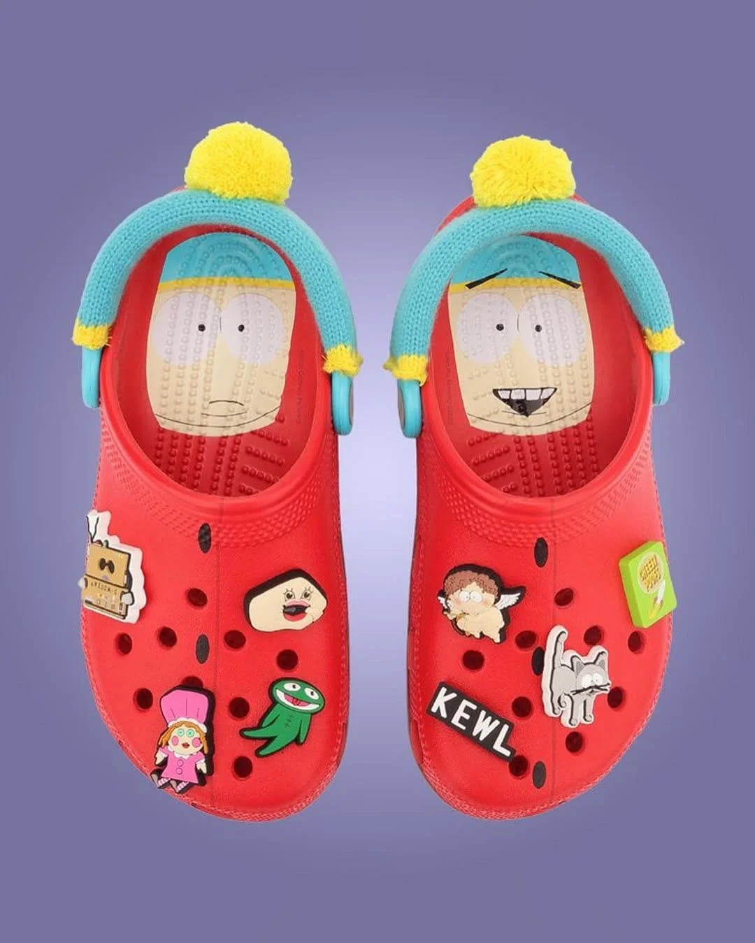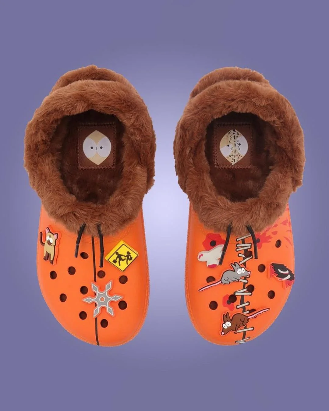 Модель, посвящённая Кенни, выполнена в оранжевом цвете и имеет коричневый мех, напоминающий капюшон его куртки. На стельке этой пары нанесены два разных портрета персонажа. Красные сабо, отсылающие к Эрику Картману, также украшены двумя его изображениями, но главная фишка — это вязаный ремешок. У него есть жёлтый помпон прямо как у шапки Эрика. Махровые фиолетовые сабо посвящены Полотенчику, а голубые — отцу Стэна Рэнди Маршу. Каждая из четырёх последних пар также украшена забавными джиббитсами.