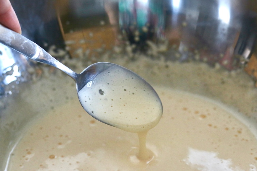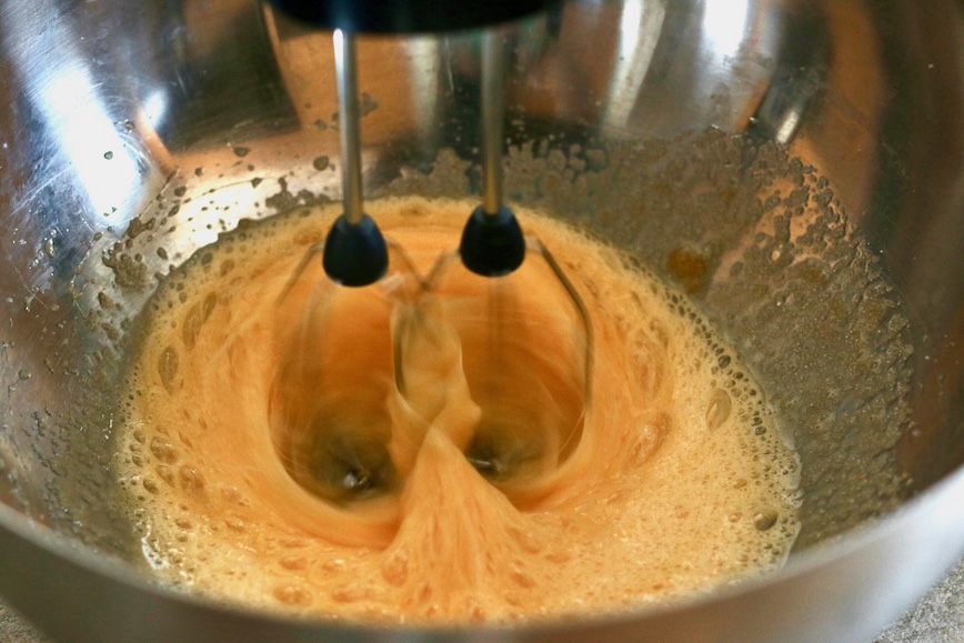 3. Поставить смесь на водяную баню и взбивать на небольшой скорости в течение пяти минут. За это время яйца с сахаром должны побелеть, увеличиться в объёме в два раза и слегка загустеть.