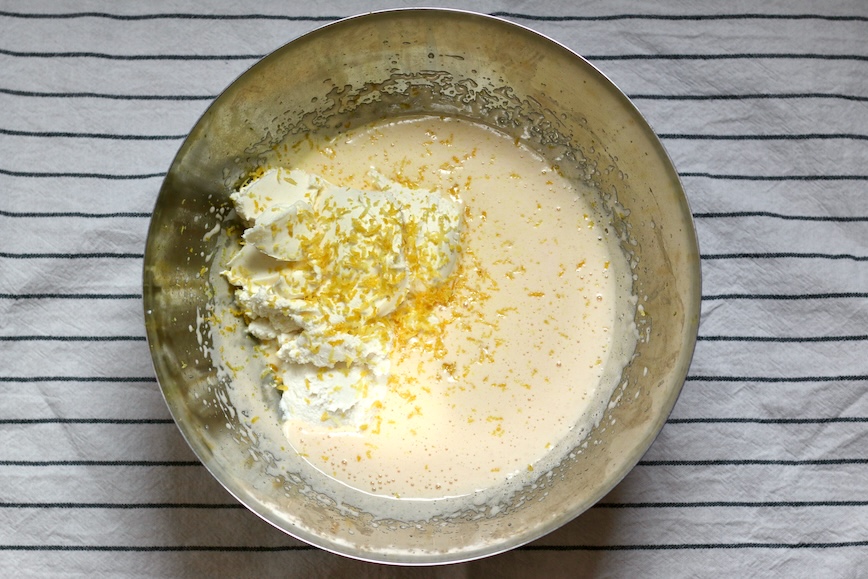 4. Добавить рикотту, маскарпоне и лимонную цедру. Снова взбить будущий десерт на небольшой скорости.