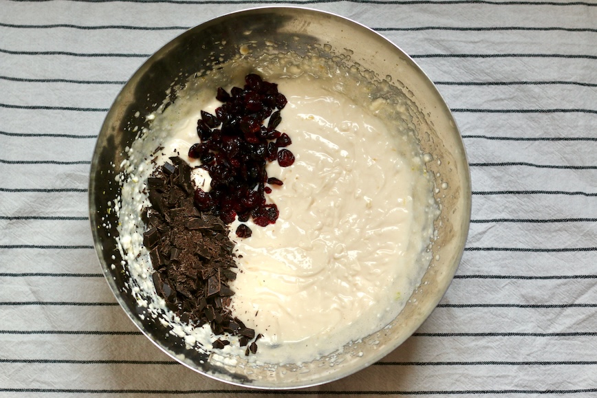 5. Шоколад мелко нарезать. Сушёную клюкву помыть и обсушить. Добавить начинку в семифредо и перемешать.