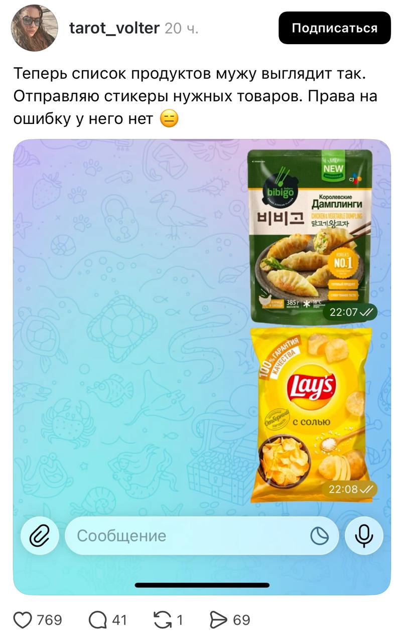 Пользовательница Threads под ником tarot_volter рассказала, что у её мужа больше «нет права на ошибку», когда он идёт за покупками в продуктовый магазин. Девушка усовершенствовала для него список покупок: она отправляет ему стикеры в виде конкретных товаров, которые нужно купить.