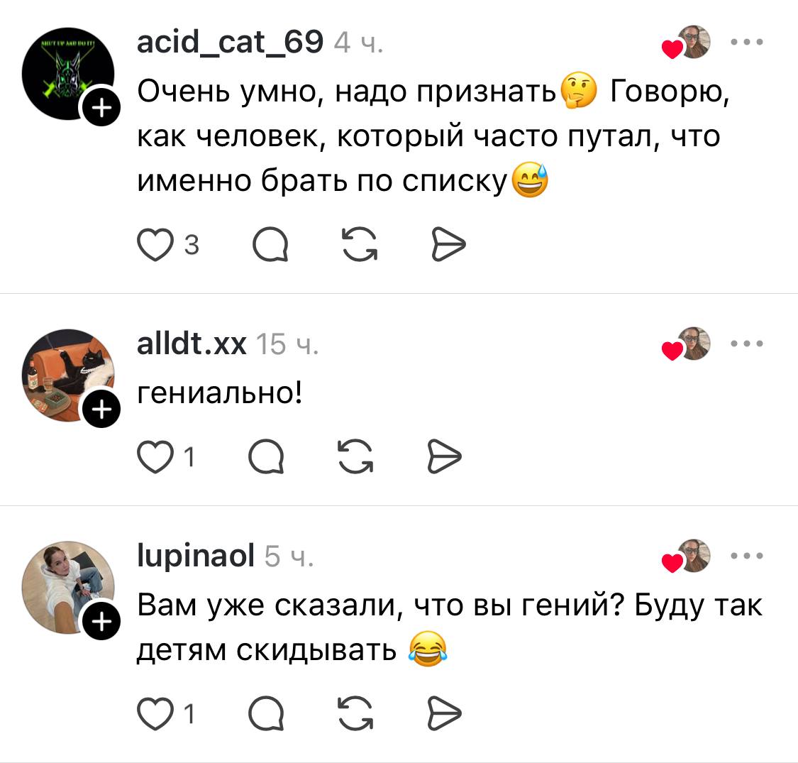 Комментаторы сочли этот лайфхак гениальным, а другие рассказали, что сами пользуются этой системой. Кто-то делает такие стикеры с товарами с помощью функции в iPhone, кто-то через телеграм и команду @pic, а кто-то просто кидает скриншот карточек с нужной продукцией.