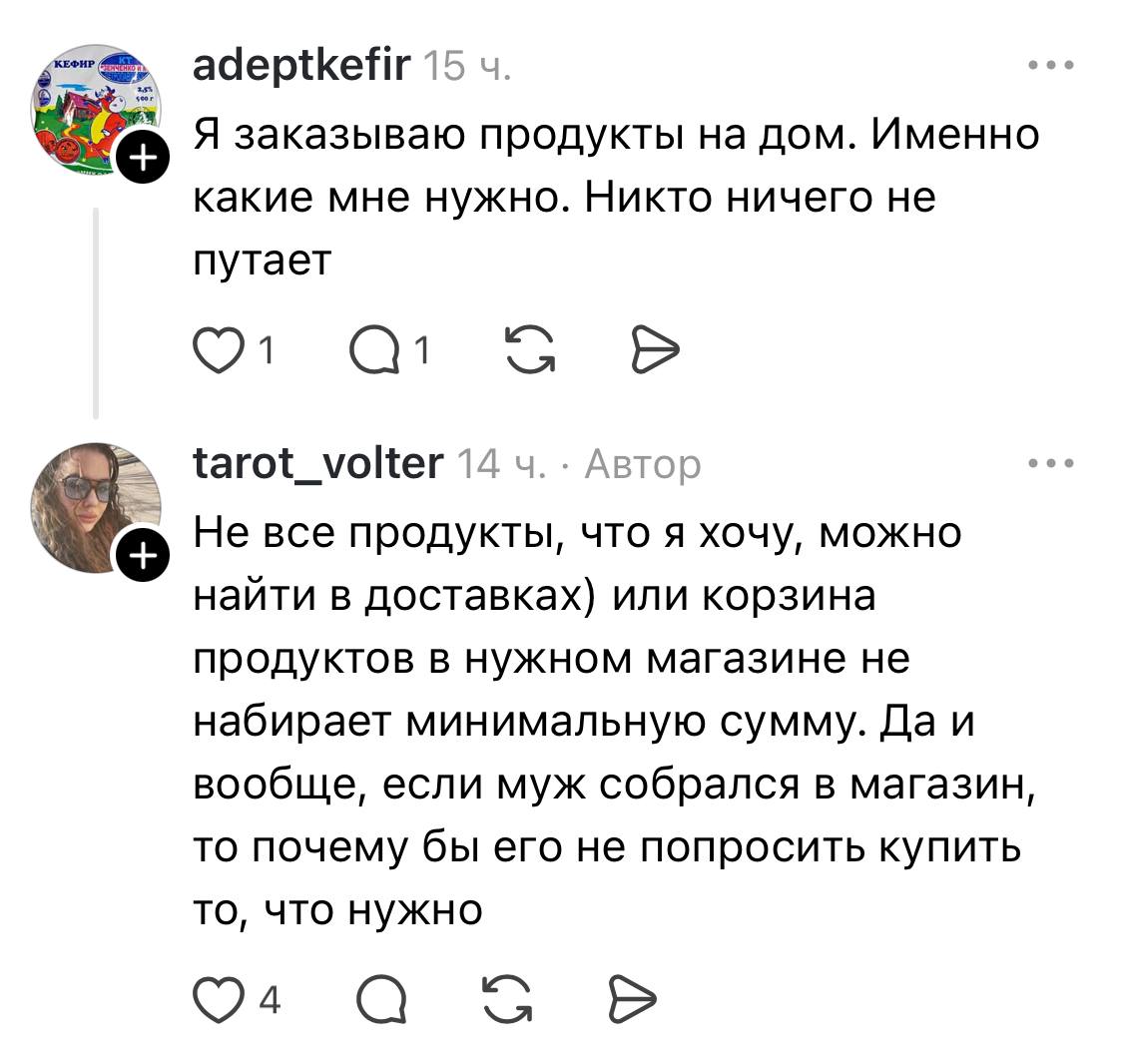 Авторка поста tarot_volter поделилась, что сначала находит все нужные товары в магазине, делает скриншоты, а потом в фотогалерее вырезает из них стикеры и отправляет мужу.