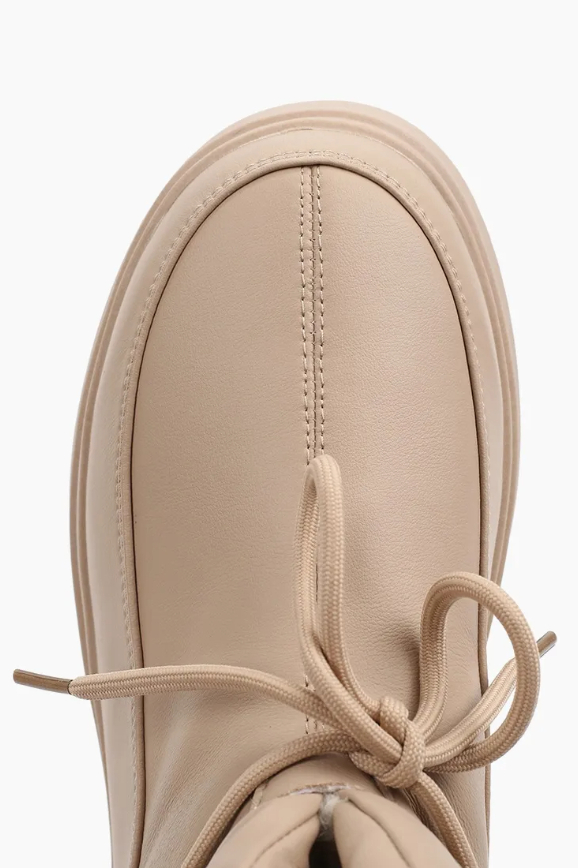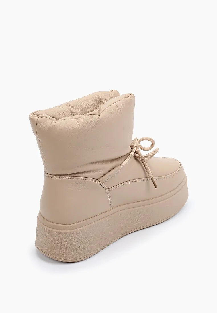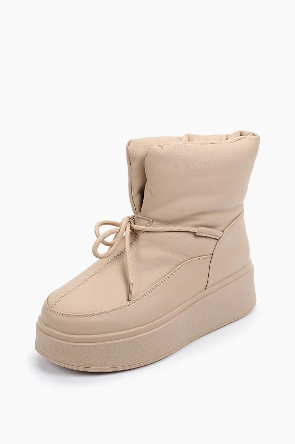 Подошва из термополиуретана с противоскользящим рисунком справляется с любой поверхностью: снегом, льдом или мокрой плиткой. Платформа высотой шесть сантиметров и шнуровка спереди делают дутики устойчивыми и комфортными для длительных прогулок. Голенище высокое и полностью закрывает щиколотку.