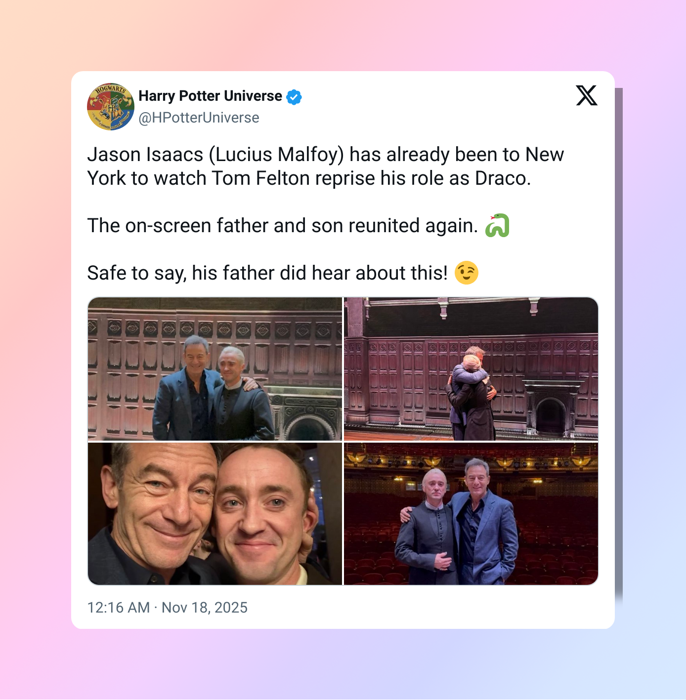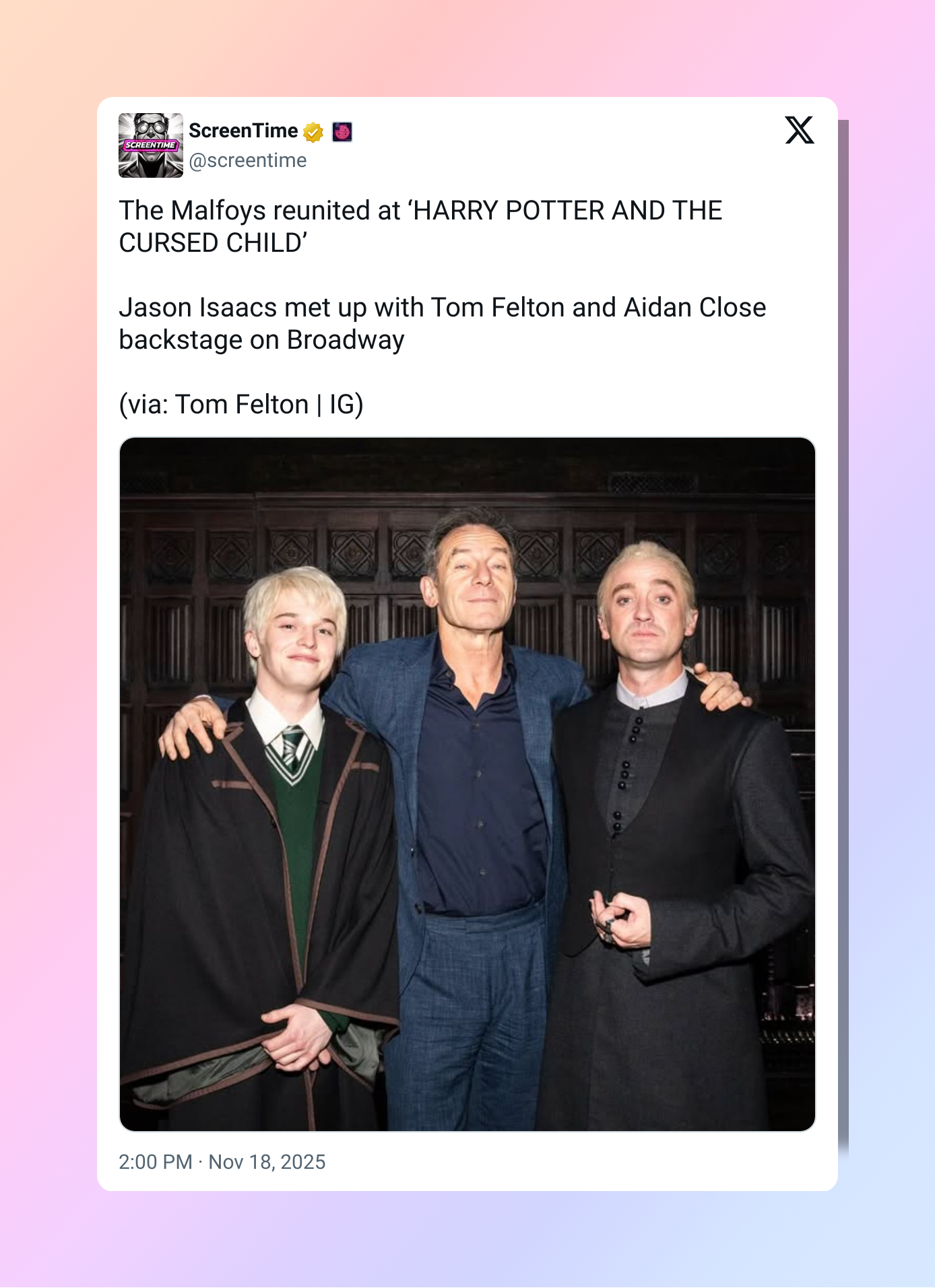 Айзекс поддержал своего экранного сына Фелтона с его дебютом на Бродвее в постановке «Гарри Поттер и Проклятое дитя». Том снова играет Драко, но на этот раз повзрослевшего и тоже ставшего отцом. Своими впечатлениями от увиденного Джейсон Айзекс поделился в соцсети. Он опубликовал снимки вместе с Фелтоном и Эйданом Клоузом, который играет сына Драко, Скорпиуса, в спектакле.