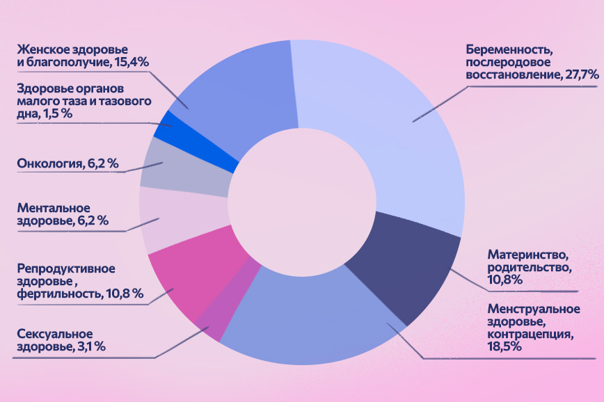 Если российский фемтех по областям, то самую большую долю рынка занимают продукты для женщин в период беременности и послеродового восстановления — 27,7%. Второе место у разработок в сфере менструального здоровья и контрацепции — 18,5%. Третье место делят решения для поддержания репродуктивного здоровья и для материнства в целом — по 10,8% каждое направление. Также на российском рынке есть не связанные с рождением детей фемтех-стартапы, но их доля не так значительна.