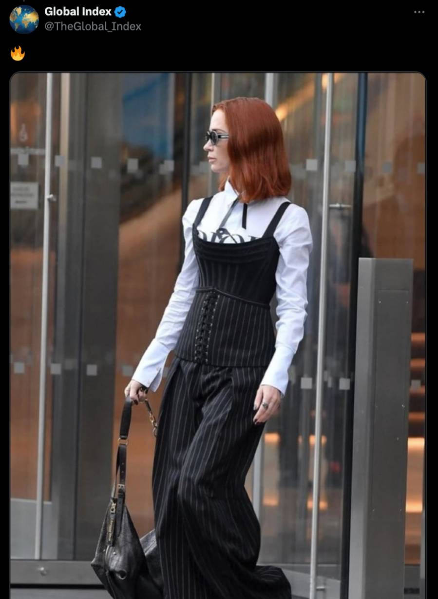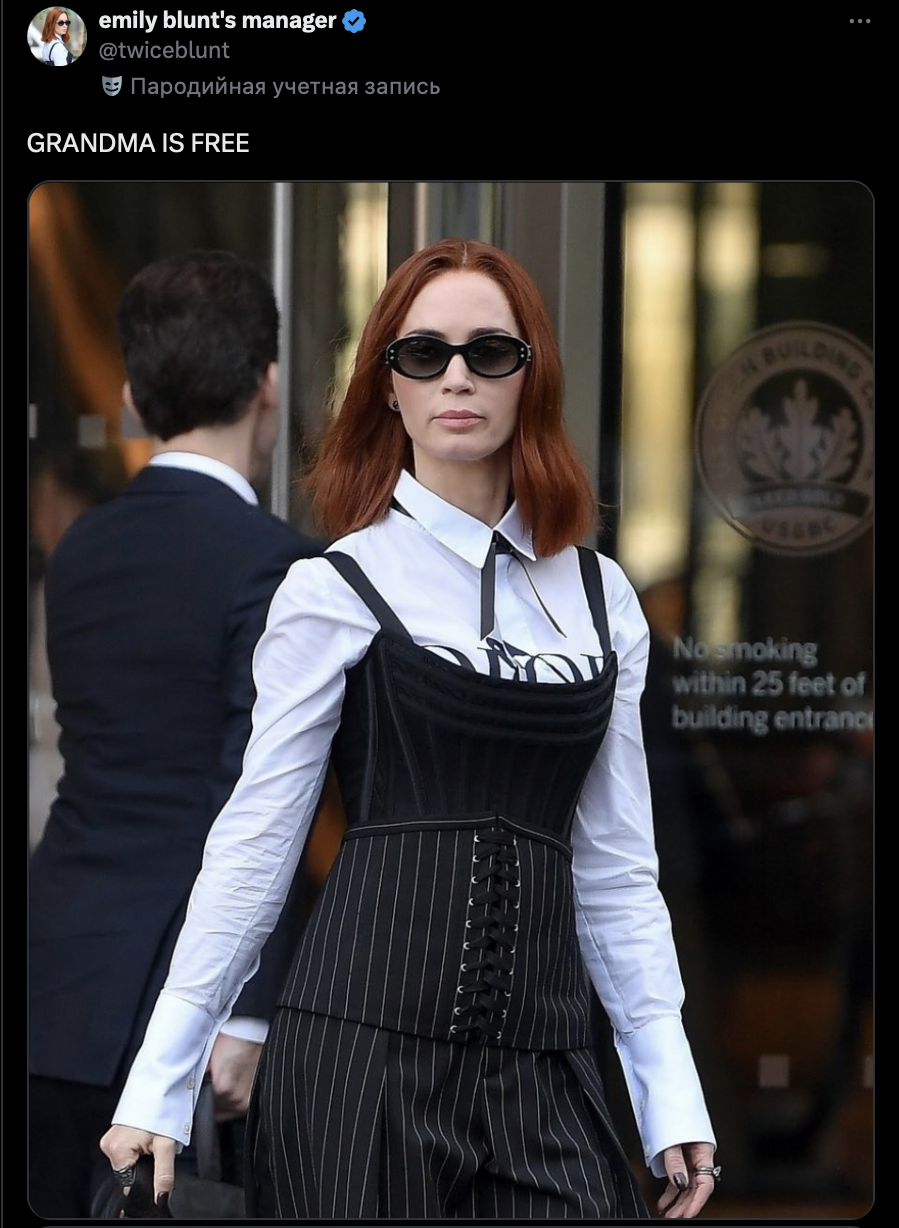 В сети появились фотографии Эмили Блант со съёмочной площадки сиквела «Дьявол носит Prada». Её героиня Эмили, которая теперь стала влиятельной бизнесвумен, прогуливалась по улице в корсете и широких брюках в полоску. Образ бывшей ассистентки Миранды Пристли собран из вещей Dior.
