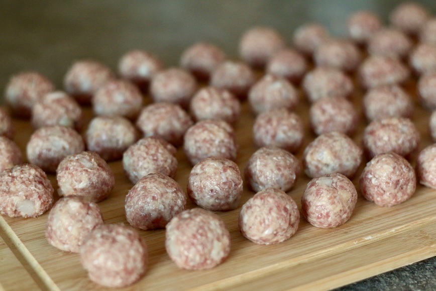 6. Добавьте соль, перец и мускатный орех. Тщательно перемешайте фарш. Скатайте фрикадельки размером примерно с грецкий орех.