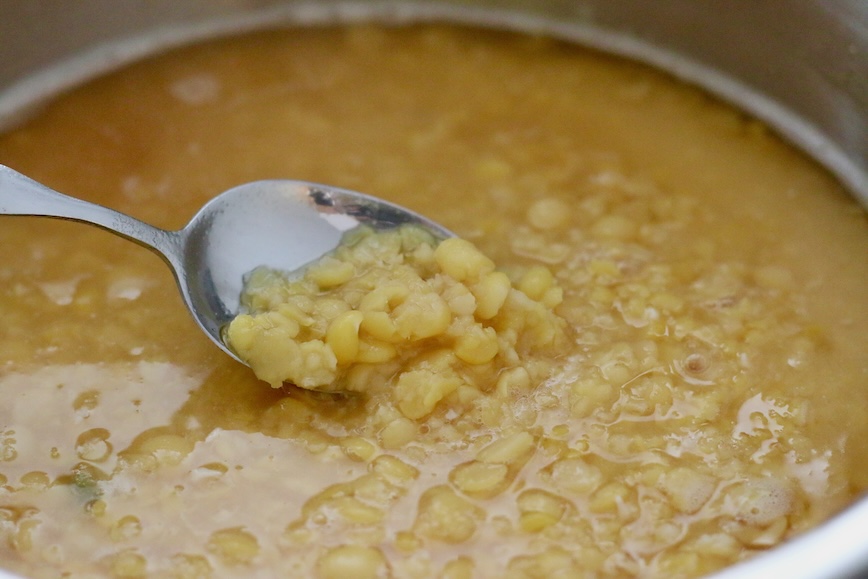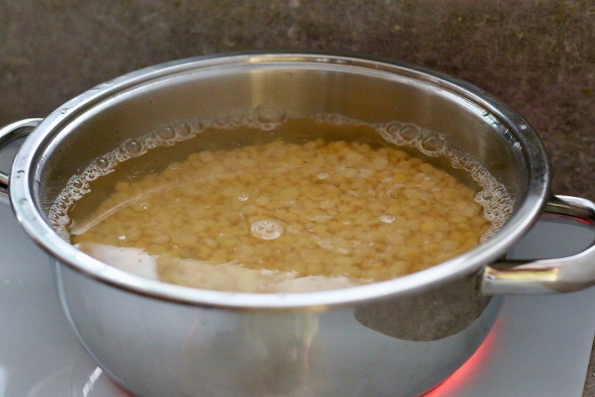 1. Горох залейте водой и оставьте на 6–8 часов или на ночь. Затем слейте жидкость, промойте бобы и добавьте свежей воды так, чтобы её уровень был примерно на два сантиметра выше гороха.
