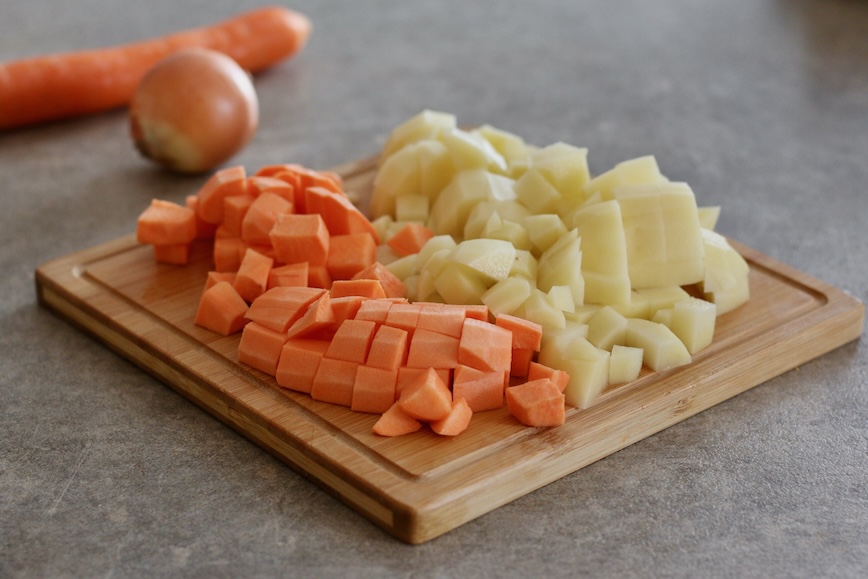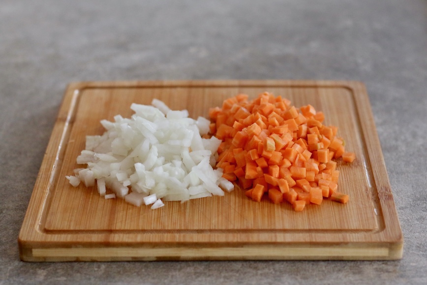 4. Тем временем мелко нашинкуйте очищенный лук. С моркови тоже снимите кожуру и нарежьте овощ небольшими кубиками или натрите на крупной тёрке.