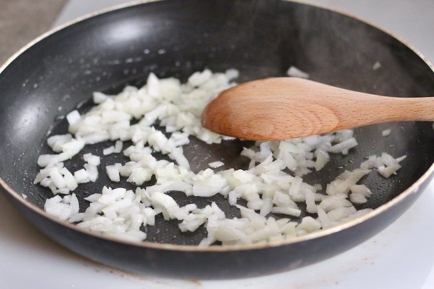6. Разогрейте на сковороде растительное масло. Обжарьте лук на среднем огне до золотистого цвета. Это займёт пару минут.