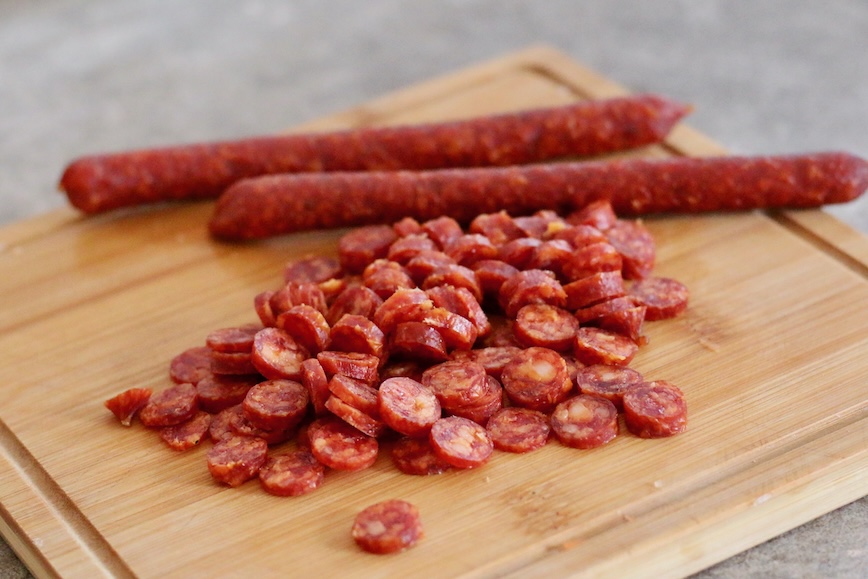 8. Всыпьте в сковороду колбаски. Готовьте 2–3 минуты. Копчёности должны слегка подрумяниться.