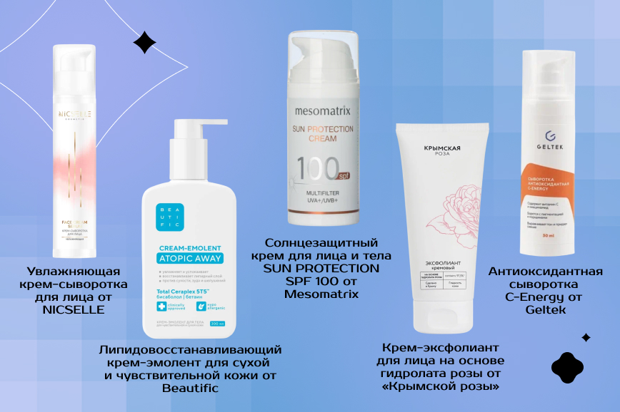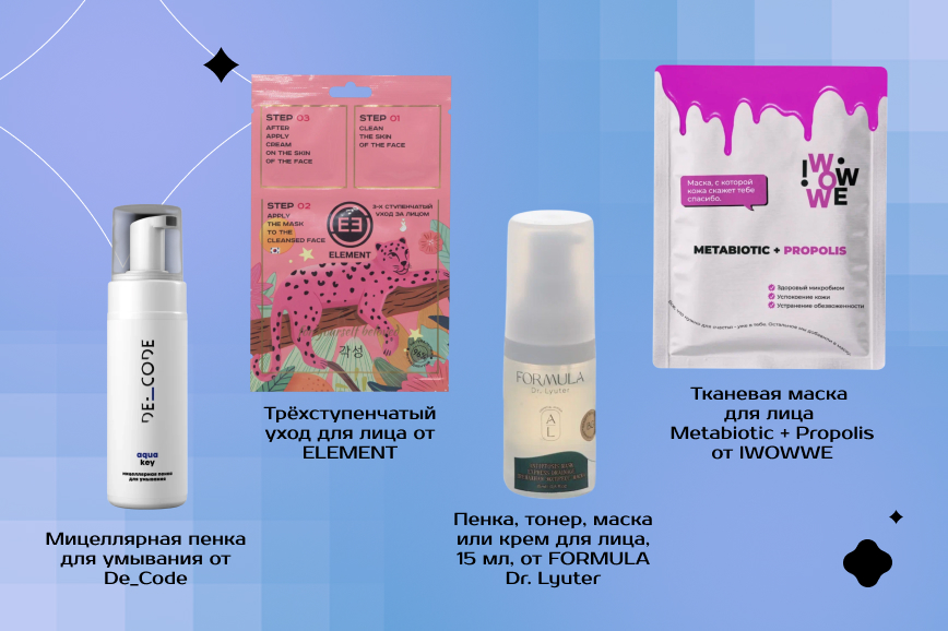 Эти средства помогут очистить кожу от пыли и остатков себума, а также придадут щёчкам нежный румянец. Можно попробовать мицеллярную пенку, морскую пену для умывания или маску, способствующую дополнительному очищению кожи. Другой вариант — мини-набор для трёхступенчатого ухода, при котором после очищения можно увлажнить кожу с помощью маски и запечатать влагу кремом.
