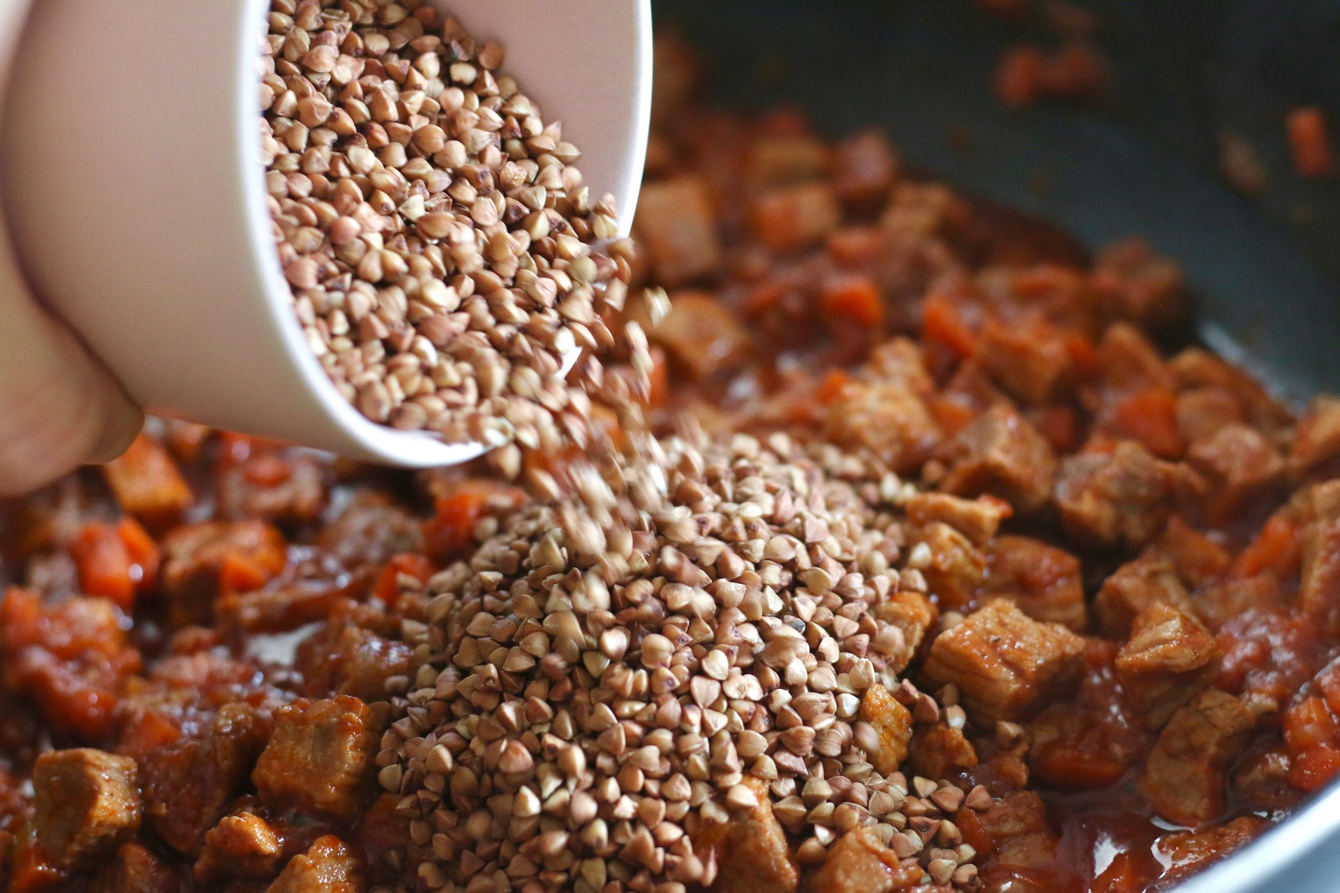 Как у любого народного блюда, у гречки по-купечески нет единственного правильного варианта приготовления. Каждый делает так, как ему больше нравится. Если есть время, можно прокалить гречку на сухой сковороде и припустить овощи отдельно от мяса. Но можно сделать проще и собрать всё в одной ёмкости — так тоже получится вкусно.