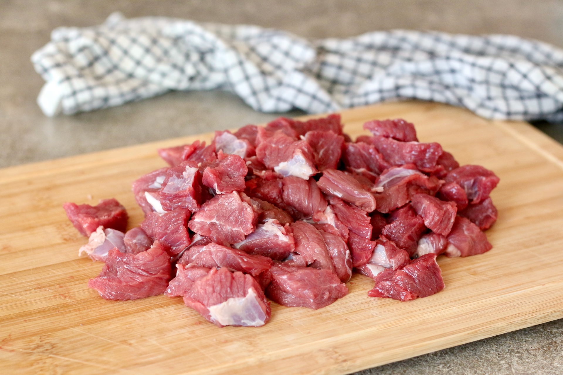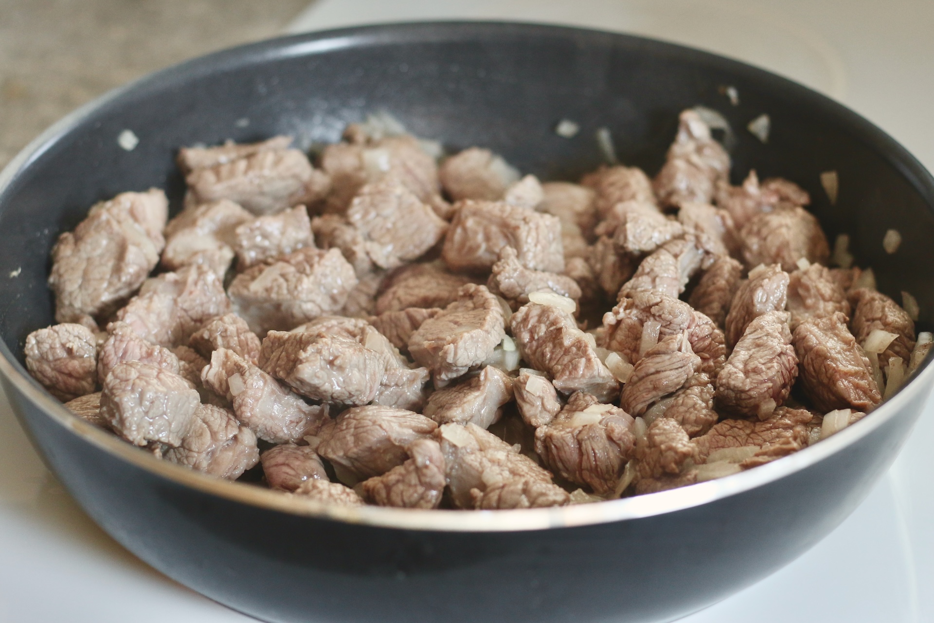 1. Говядину нарежьте небольшими кубиками. Уберите прожилки и плёночки, если они есть.