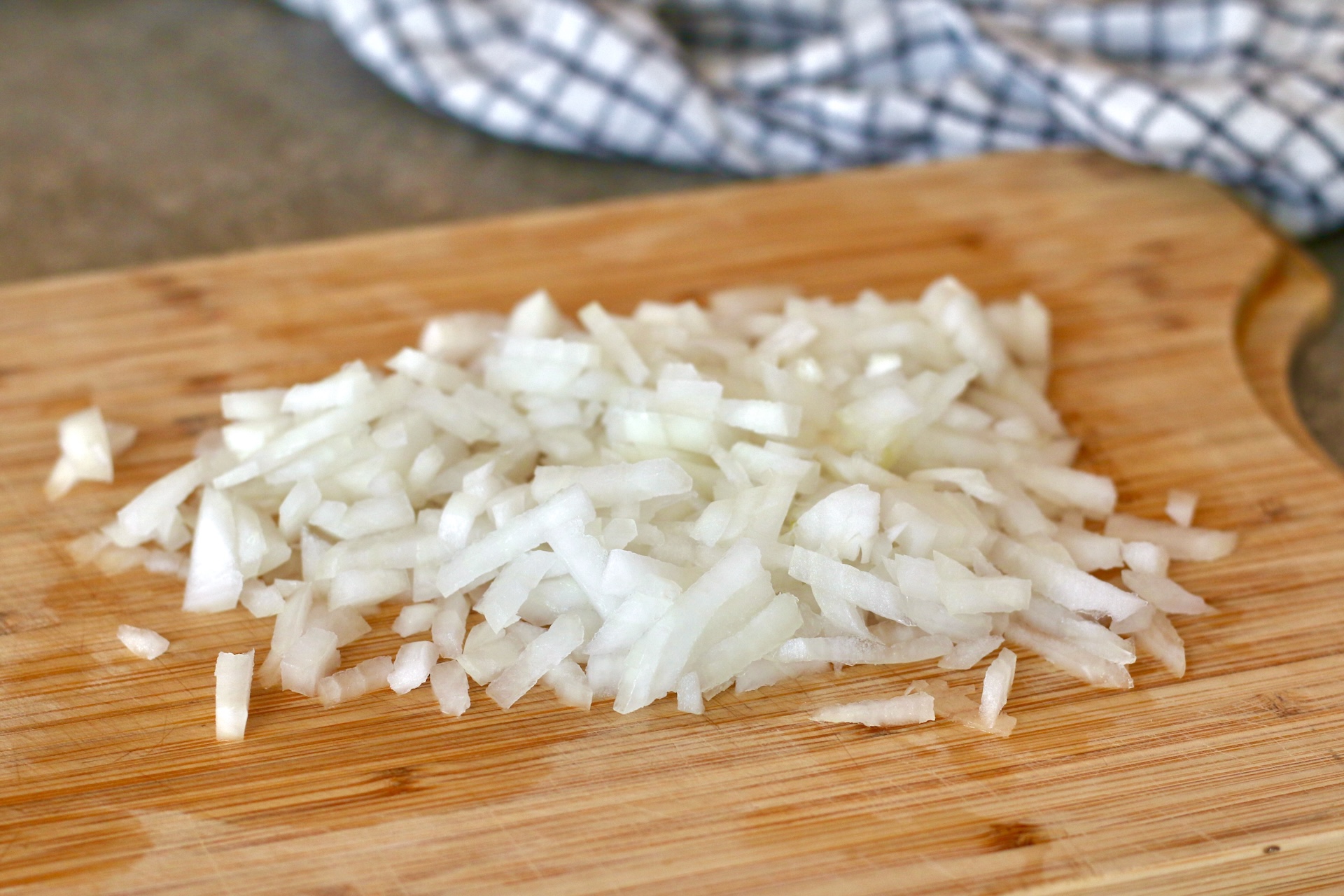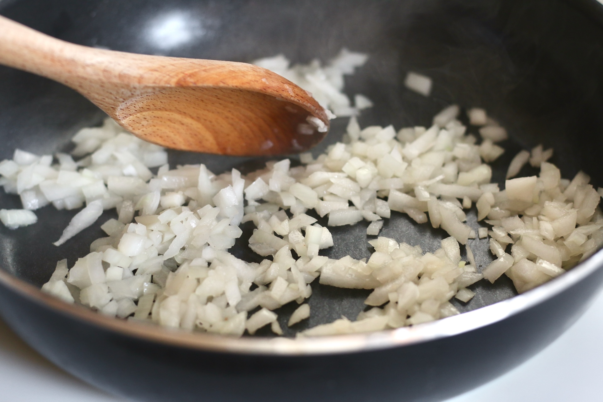 4. На пустой сковороде на сильном огне пассеруйте лук до румяного цвета. Это займёт пару минут.