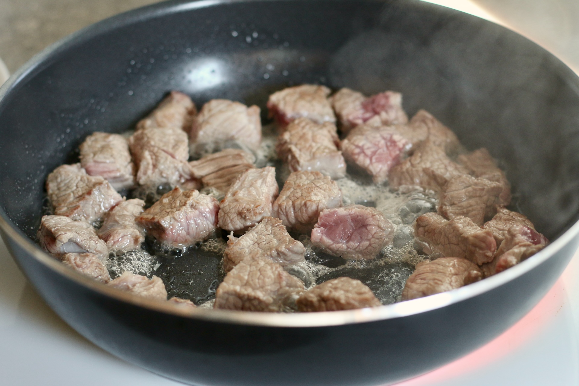 3. В сковороде с толстым дном и высокими бортами разогрейте подсолнечное масло. Выложите часть мяса в один слой и обжарьте на сильном огне с обеих сторон. Это займёт пару минут. Затем переложите кусочки на тарелку и обжарьте оставшуюся говядину. Затем тоже уберите её со сковороды.